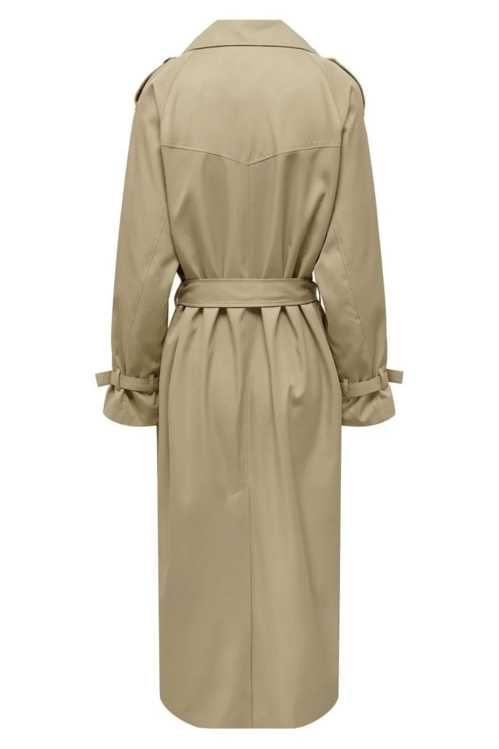 Beige trenchcoat med revers og dobbeltknaplukning fra Only. Den lange frakke har et klassisk snit med brede revers og et matchende bælte.