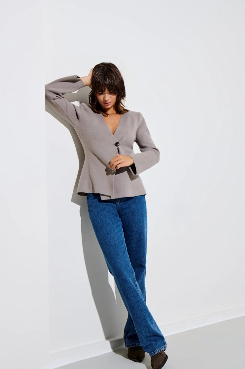 Grå cardigan fra Only med en enkelt knap. Den slanke pasform og V-udskæring giver cardiganen et rent og enkelt design i en neutral Moon Rock Melange-farve.