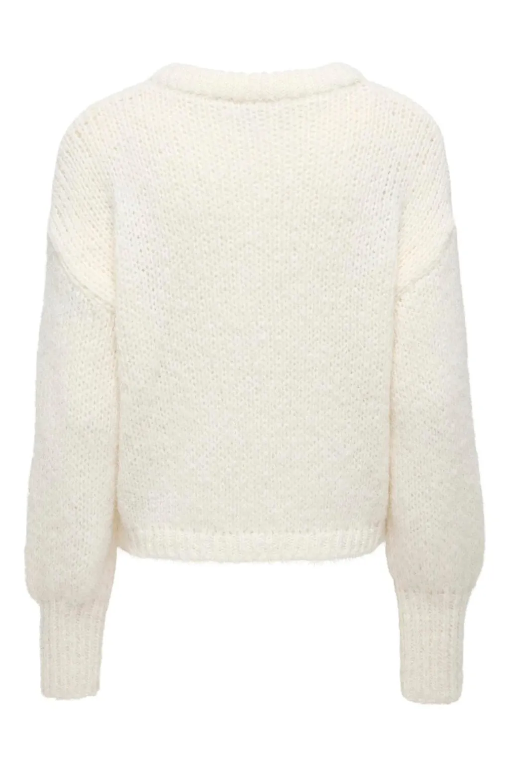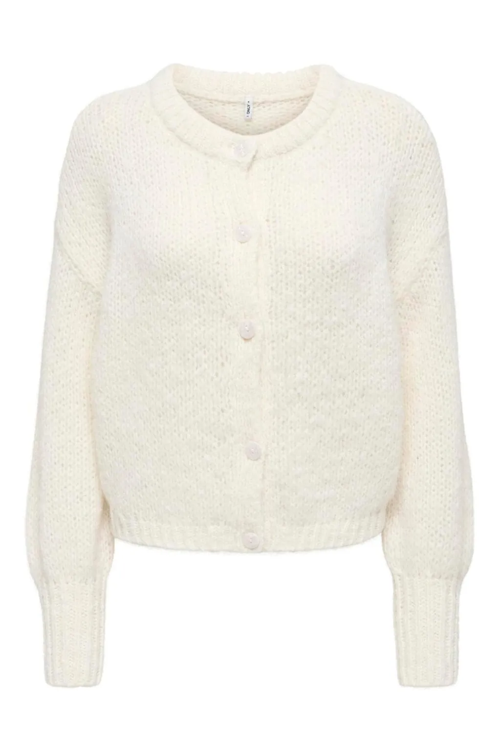 En hvid cardigan fra Only, lavet af 100 % genanvendt polyester. Cardiganen har en V-hals og knaplukning foran med matchende knapper.
