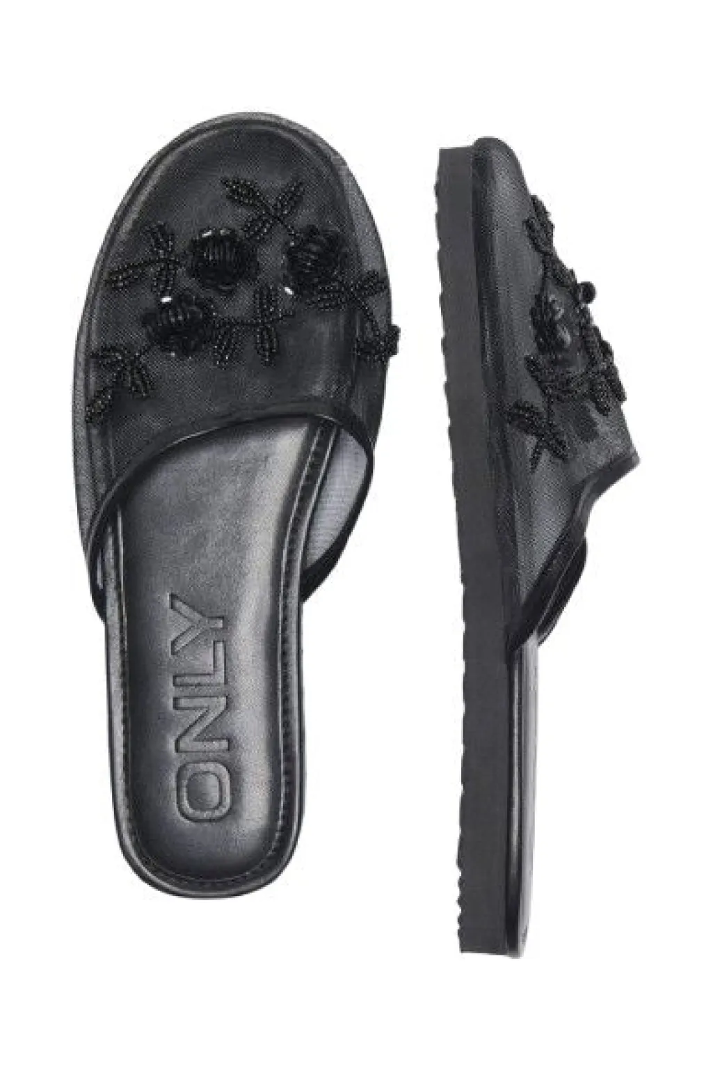Sorte slippers fra Only Shoes med mesh-design. Slippersene har blomsterformede perledetaljer og pailletter på overdelen, som giver et fint udtryk til det enkle design.
