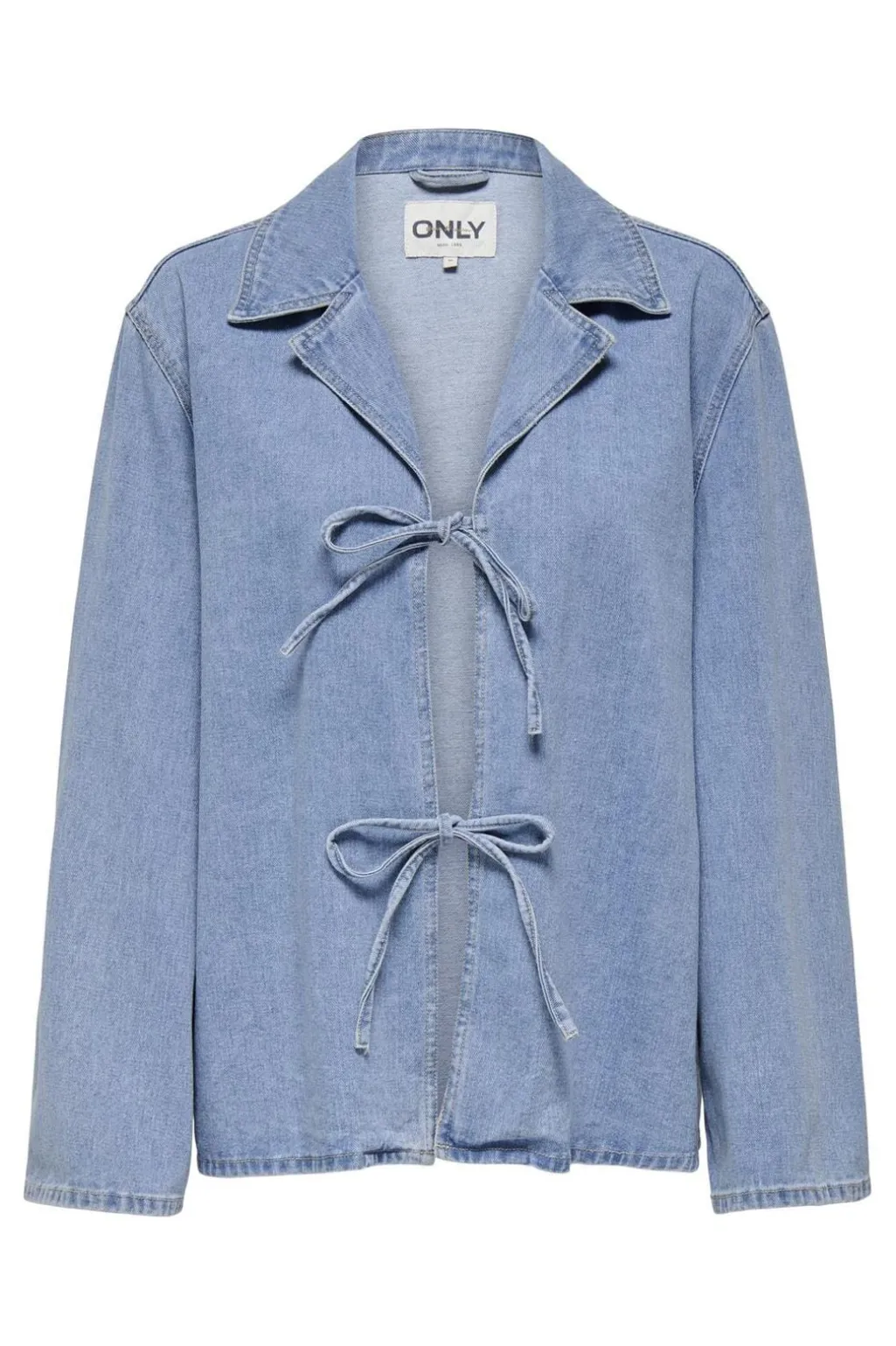Lyseblå denimjakke fra Only med bindebånd foran. Jakken har en klassisk skjortekrave og to sløjfer, der giver mulighed for at tilpasse pasformen.