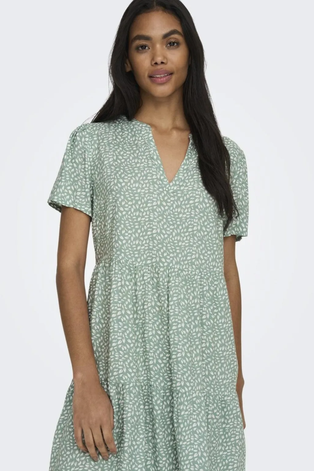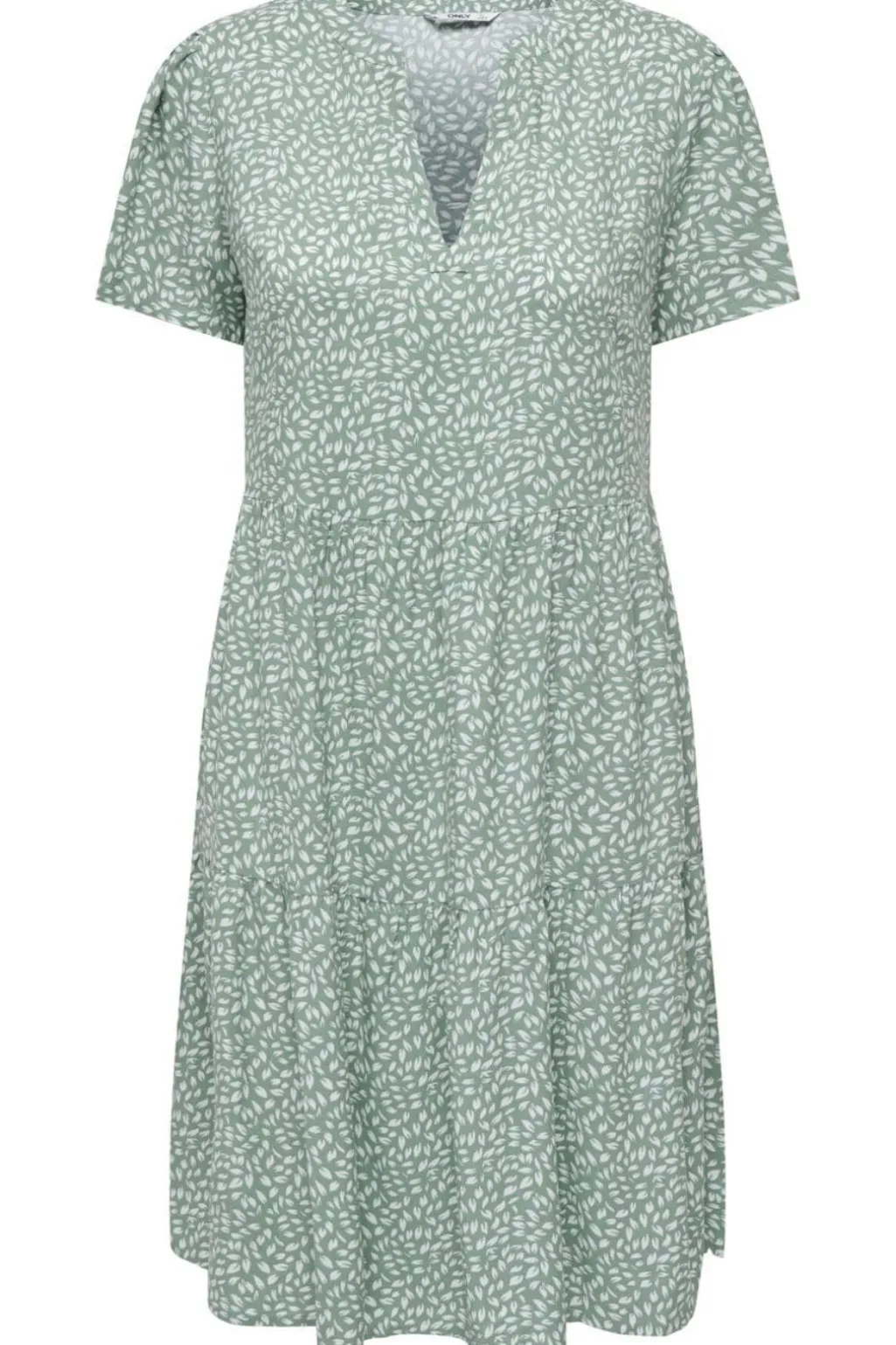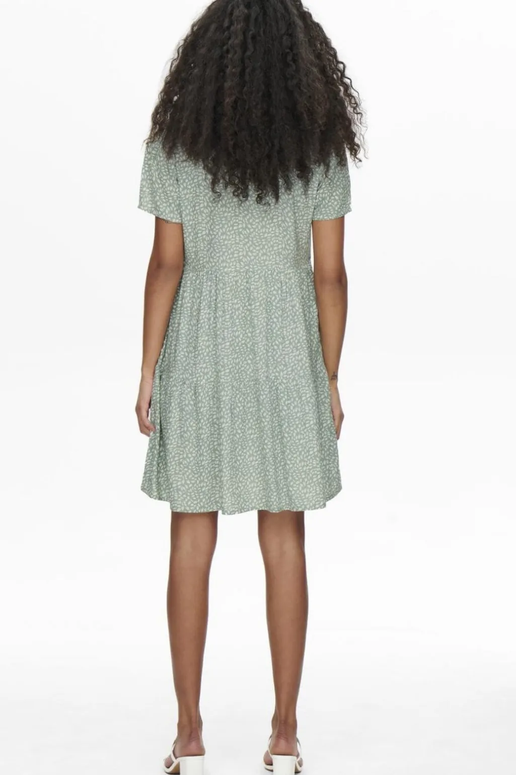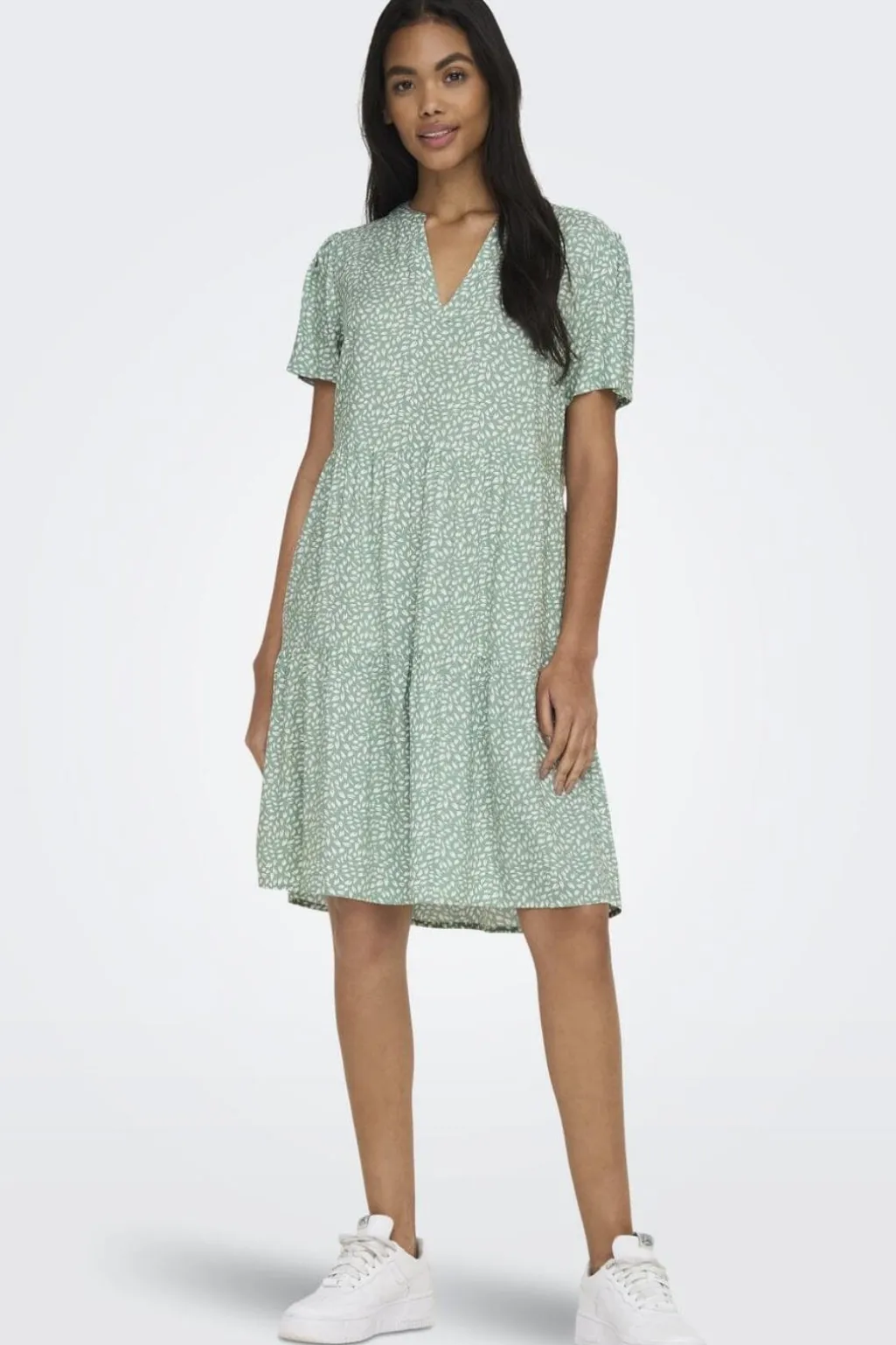 Grøn kjole fra Only med hvidt bladmønster. Kjolen har en v-halsudskæring og korte ærmer. Flæser og markeret talje giver kjolen en feminin silhuet.
