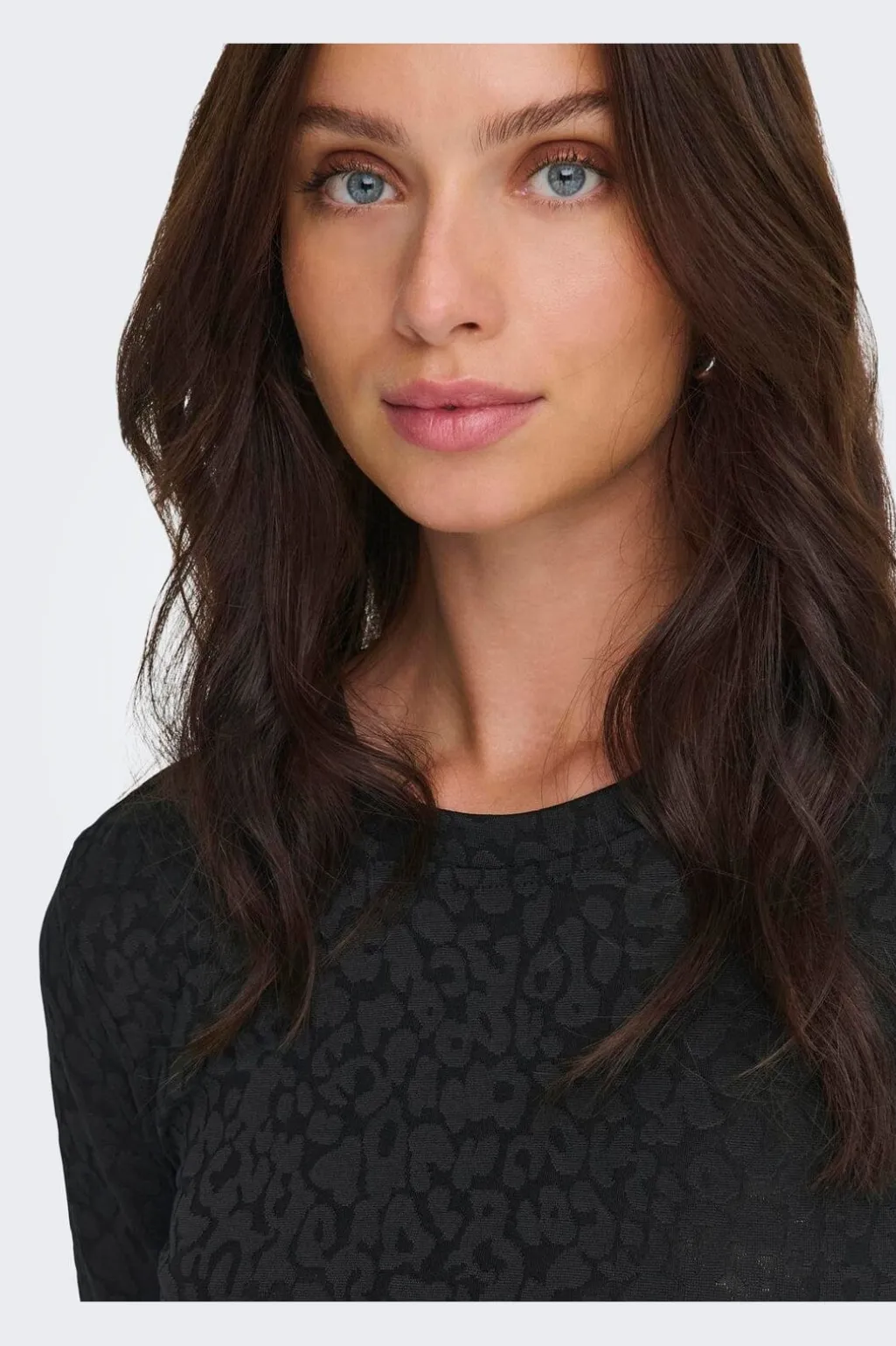 Sort langærmet top fra Only med rund hals og leopardmønster. Toppen har en kropsnær pasform og er lavet i en blød kvalitet med stræk, hvilket gør den behagelig at have på.