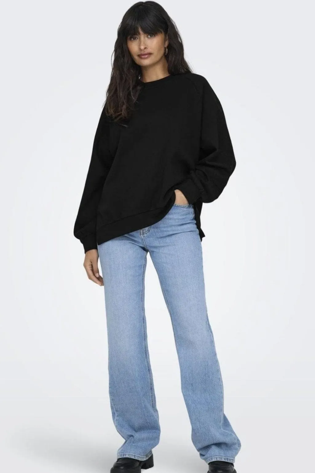 Sort sweatshirt fra Only med en oversize pasform. De lange ærmer har rhinsten-detaljer og en let puf-effekt ved manchetterne. Sweatshirten har en rund halsudskæring.