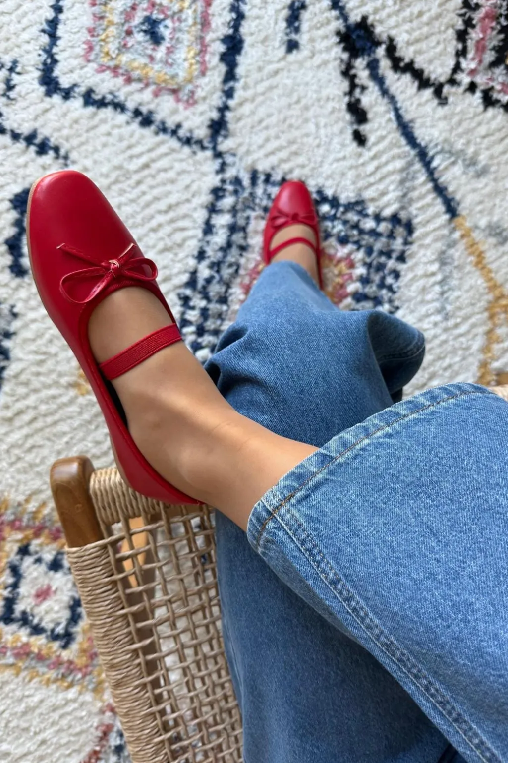 Røde ballerina-sko fra Bloom med sløjfe og elastisk rem over foden. Skoen har en rund tå og flad bund, der giver god støtte.