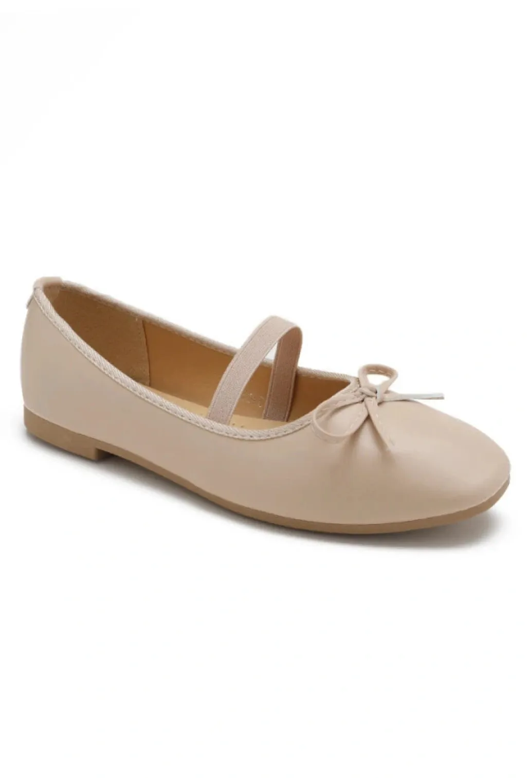 Beige ballerinasko fra Bloom med rund tå og sløjfedetalje. Skoen har en lav hæl og snørelukning, som gør den praktisk til både hverdag og fest.