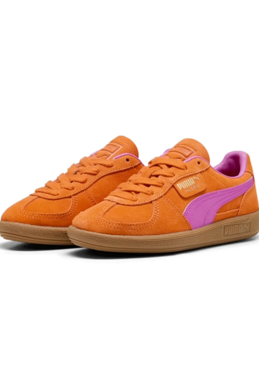 Orange sneakers fra Puma med lilla detaljer. Skoene har en overdel i ruskind og en slidstærk gummisål. Den klassiske Palermo-model kombinerer sporty design med gode materialer.