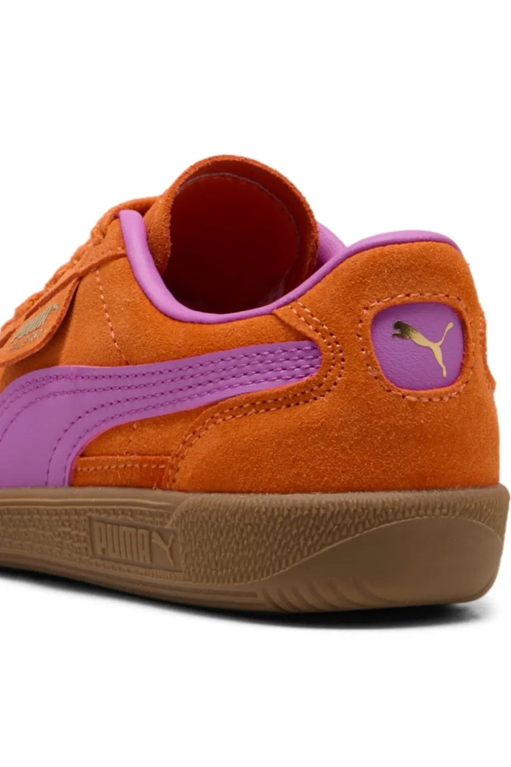 Orange sneakers fra Puma med ruskindsoverdel og lilla detaljer. Palermo-modellen kombinerer street style med sporty elementer gennem sin klassiske udformning.