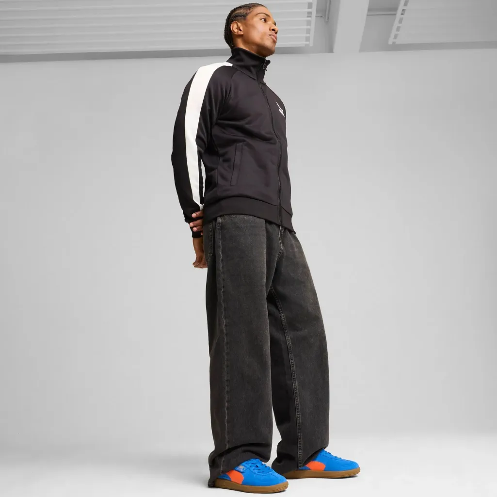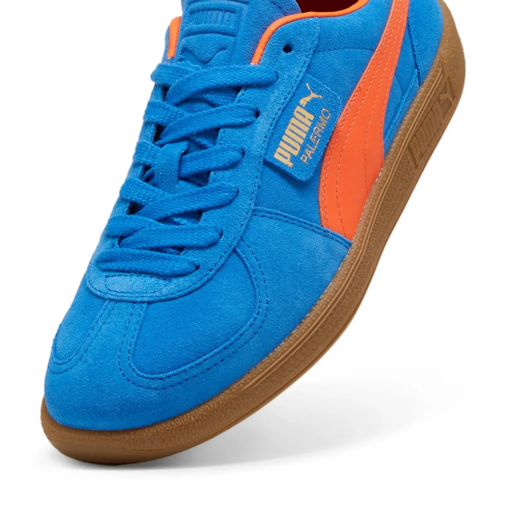 Blå sneakers fra Puma med orange detaljer og gummisål. Skoen har et sporty design med Palermo-logo på siden og en klassisk snørelukning.