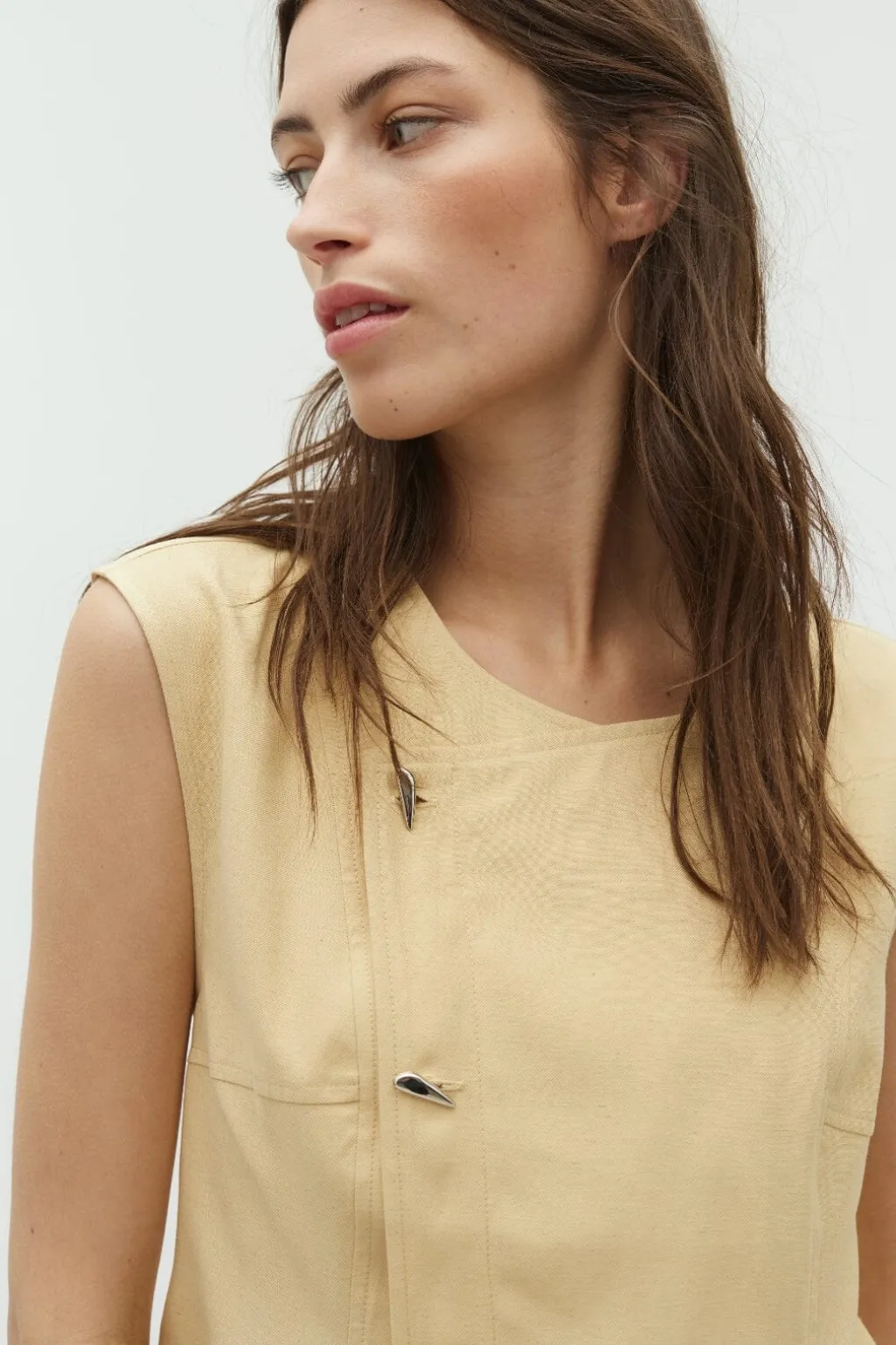 Ærmeløs top fra Global Funk i smørgul melange. Toppen har en rund halsudskæring og dekorative syninger, der giver et håndværksmæssigt præg. Knapperne foran skaber en praktisk lukning.