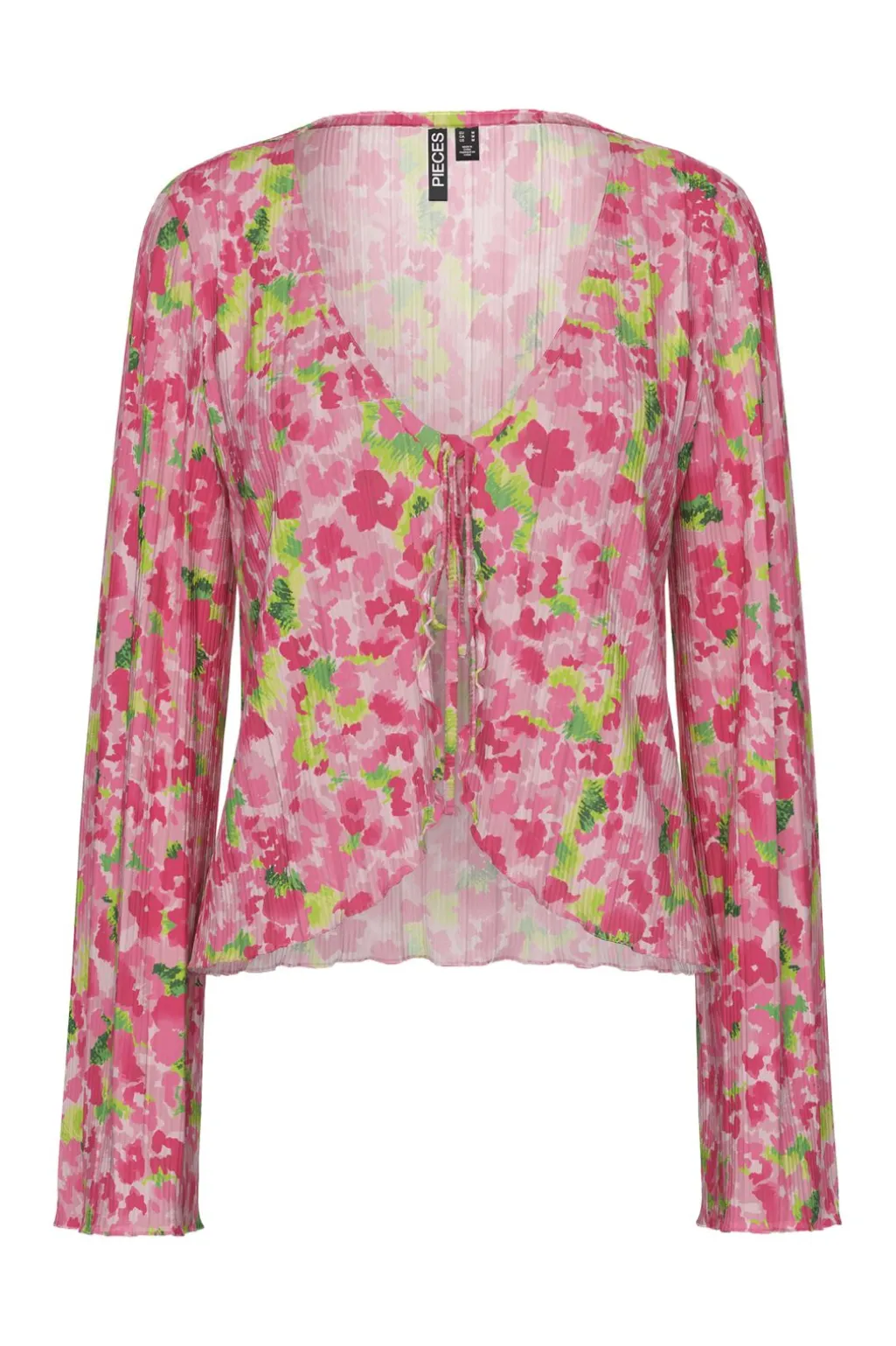 Langærmet top fra Pieces med blomsterprint i pink og grønne nuancer. Toppen har en V-halsudskæring med bindedetalje og en let transparent kvalitet.