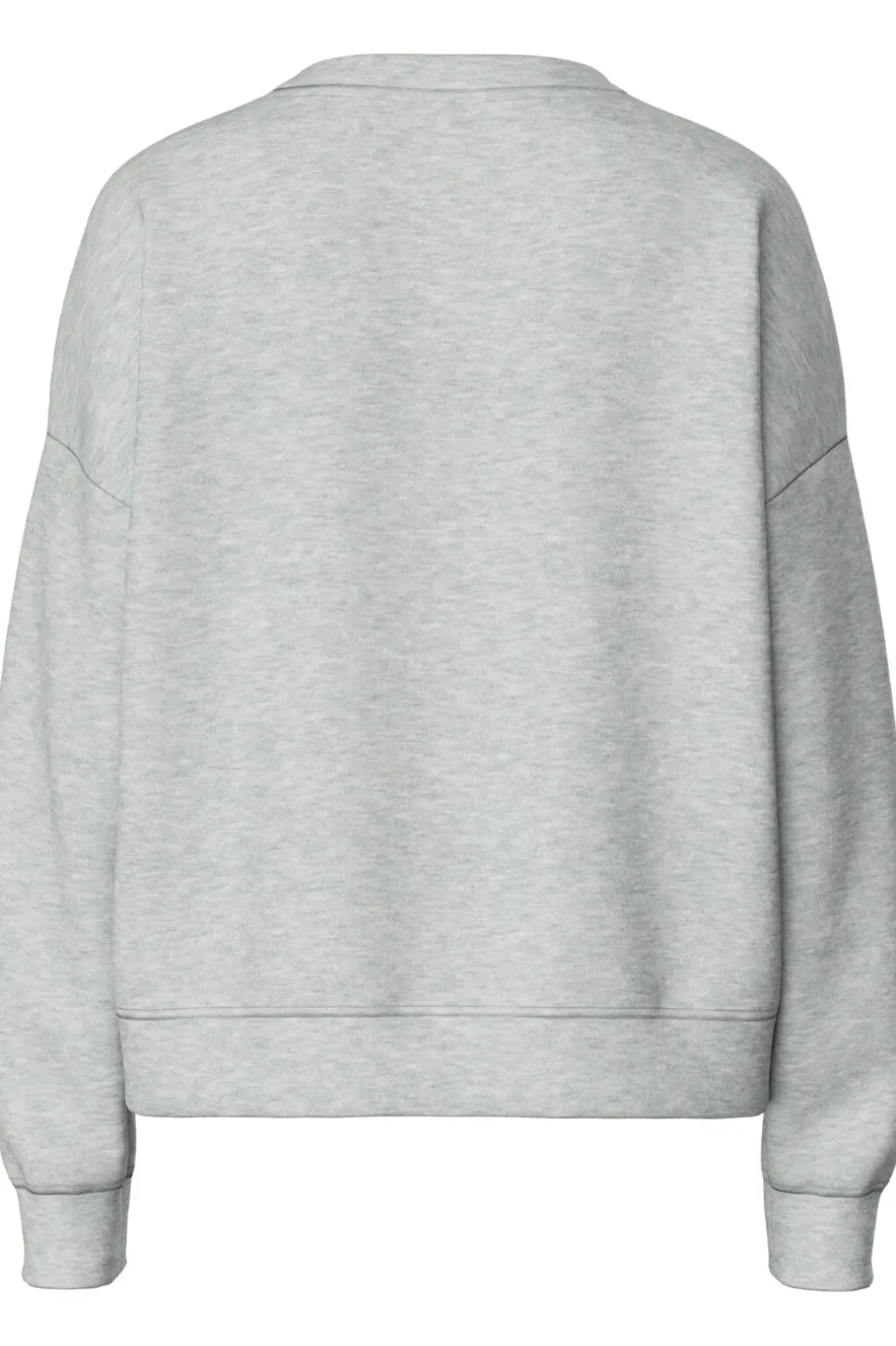 Lys grå sweatshirt fra Pieces med rund hals og lange ærmer. Sweatshirten har en regular fit og elastiske manchetter ved håndleddene. Den melerede overflade giver et roligt udtryk.