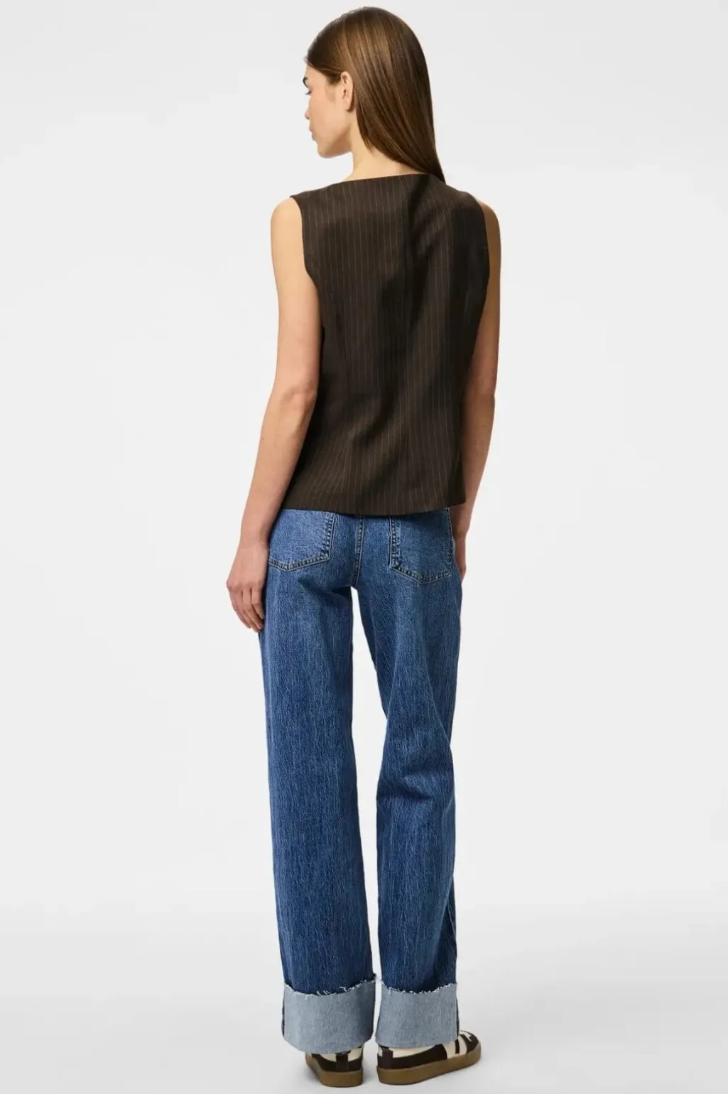 Brun pinstripet vest fra Pieces med knaplukning foran. Vesten er lavet af twill med højt trådtal og har en rund halsudskæring. Den har snydelommer og er fuldt foret.