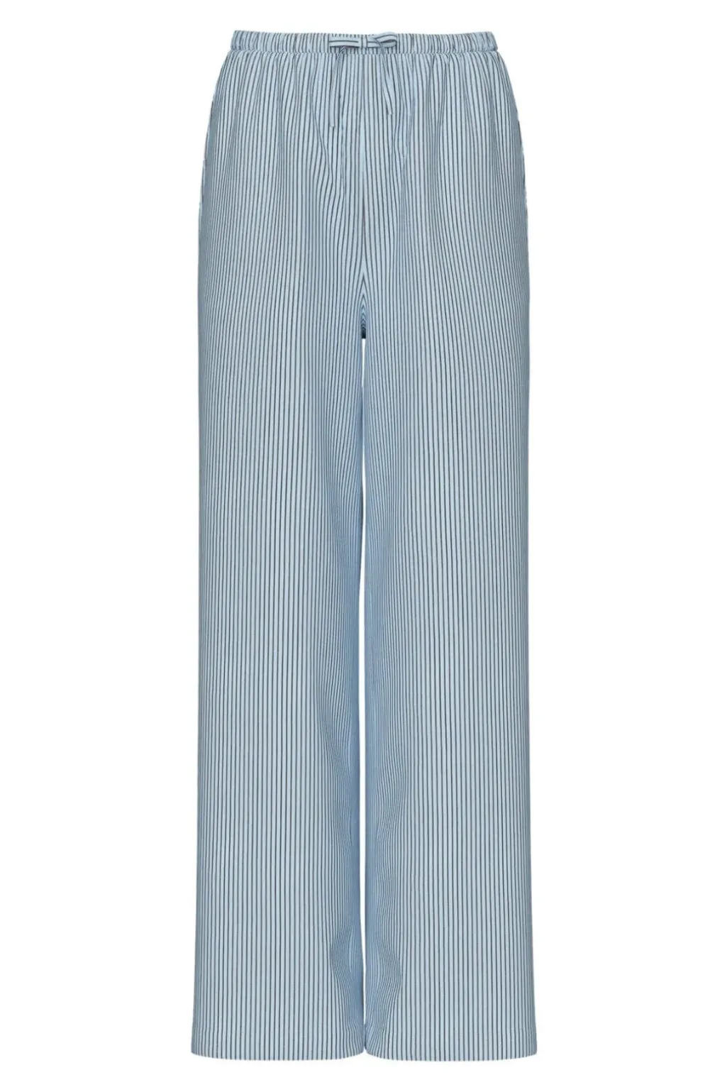 Stribede bukser fra Pieces i lyseblå med hvide lodrette striber. Bukserne har en løs pasform og høj talje.