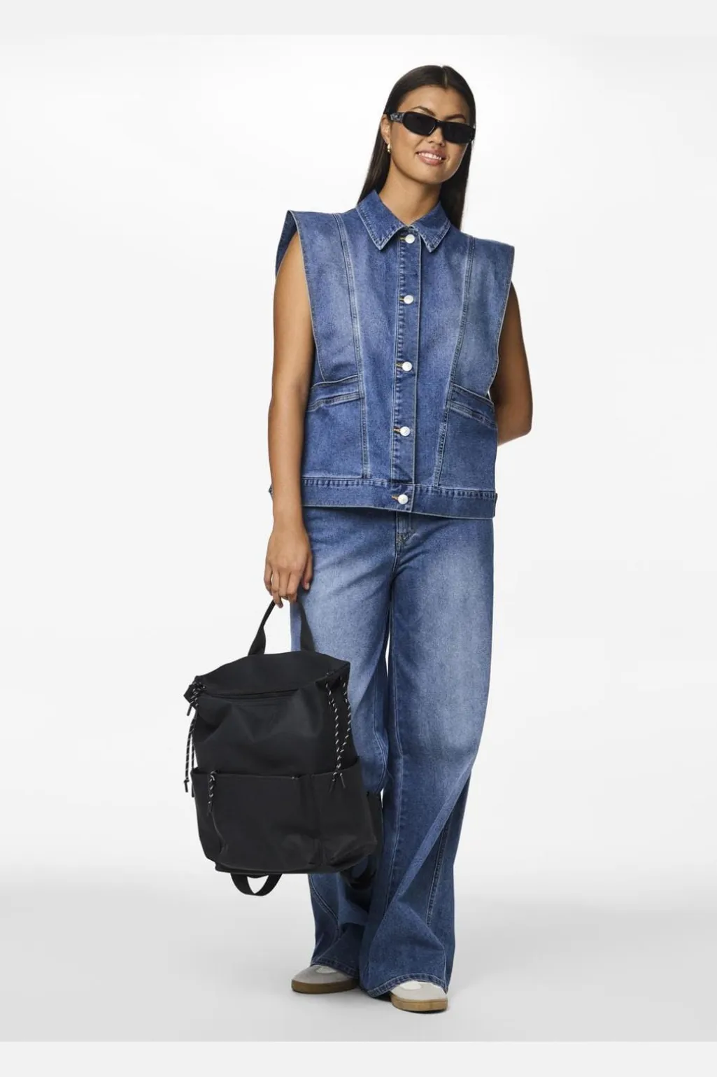 Brede jeans fra Pieces i medium blå denim. Jeansene har en høj talje og en løs pasform med brede ben, der går helt ned til gulvet.