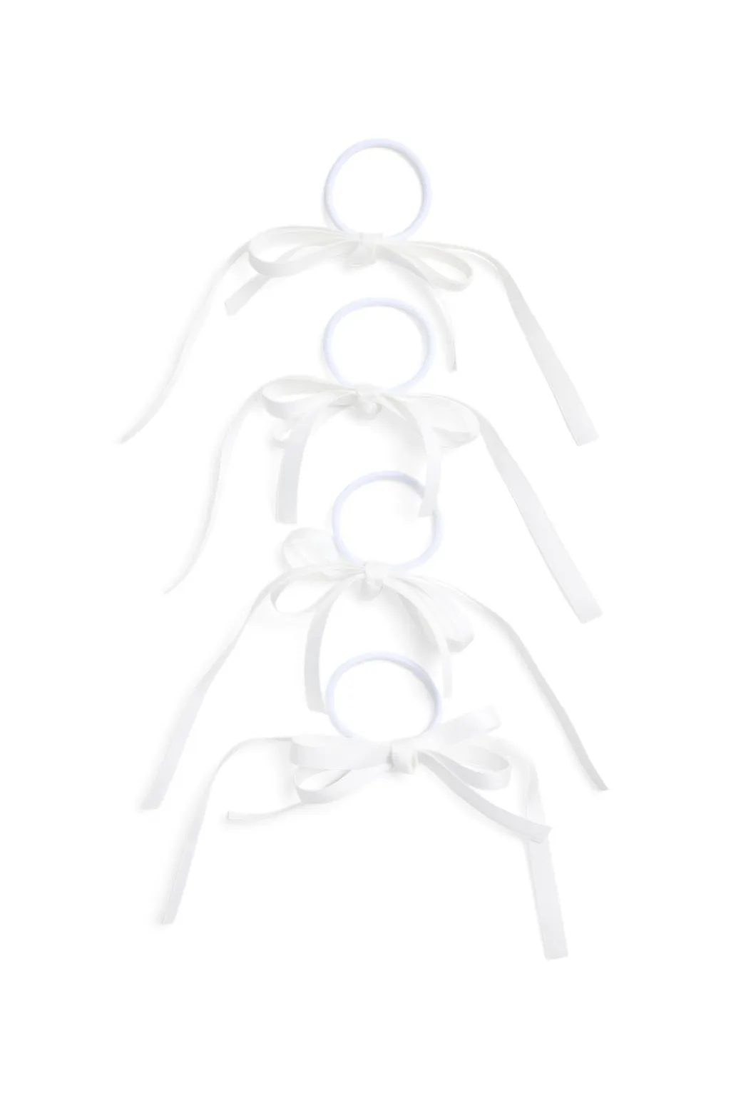Hvide hårbånd fra Pieces med sløjfedetalje og silkeagtig overflade. Sættet indeholder fire elastiske hårbånd, der er lavet af et blødt materiale med god elasticitet.