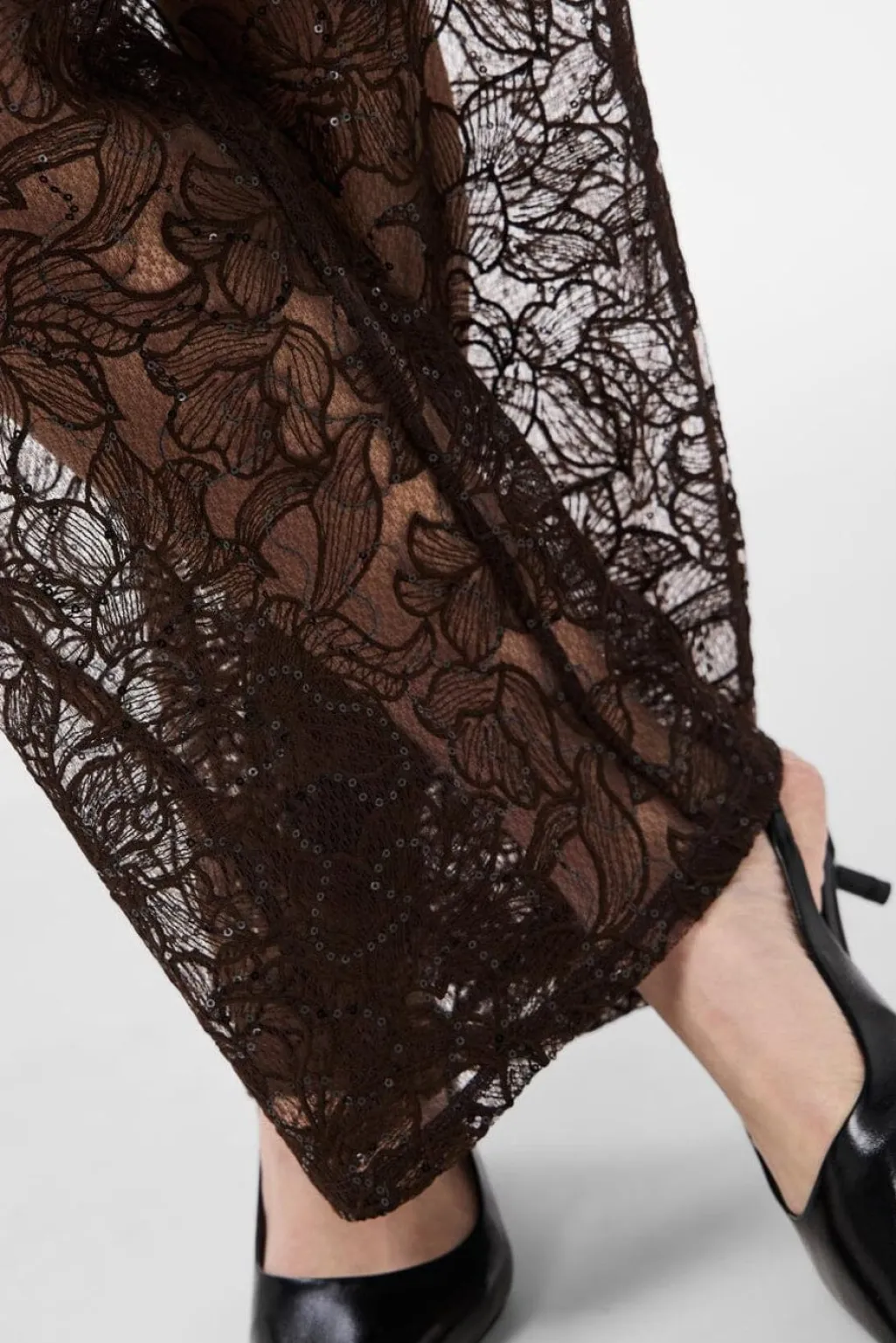 Lige bukser fra Pieces, lavet af gennemsigtig blonde med blomstermønster og pailletter i en mørk brun nuance.