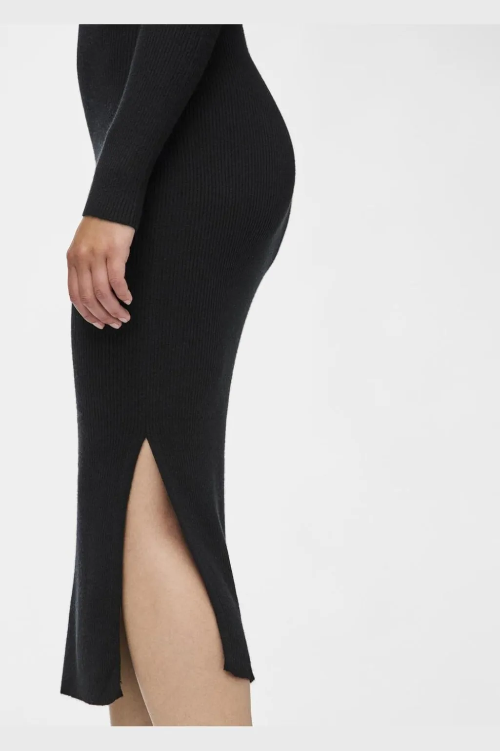 Sort strikkjole fra Pieces med ribstrik-konstruktion. Kjolen har en tætsiddende pasform og når ned til læggene. Den runde halsudskæring og de lange ærmer giver kjolen et enkelt udtryk.