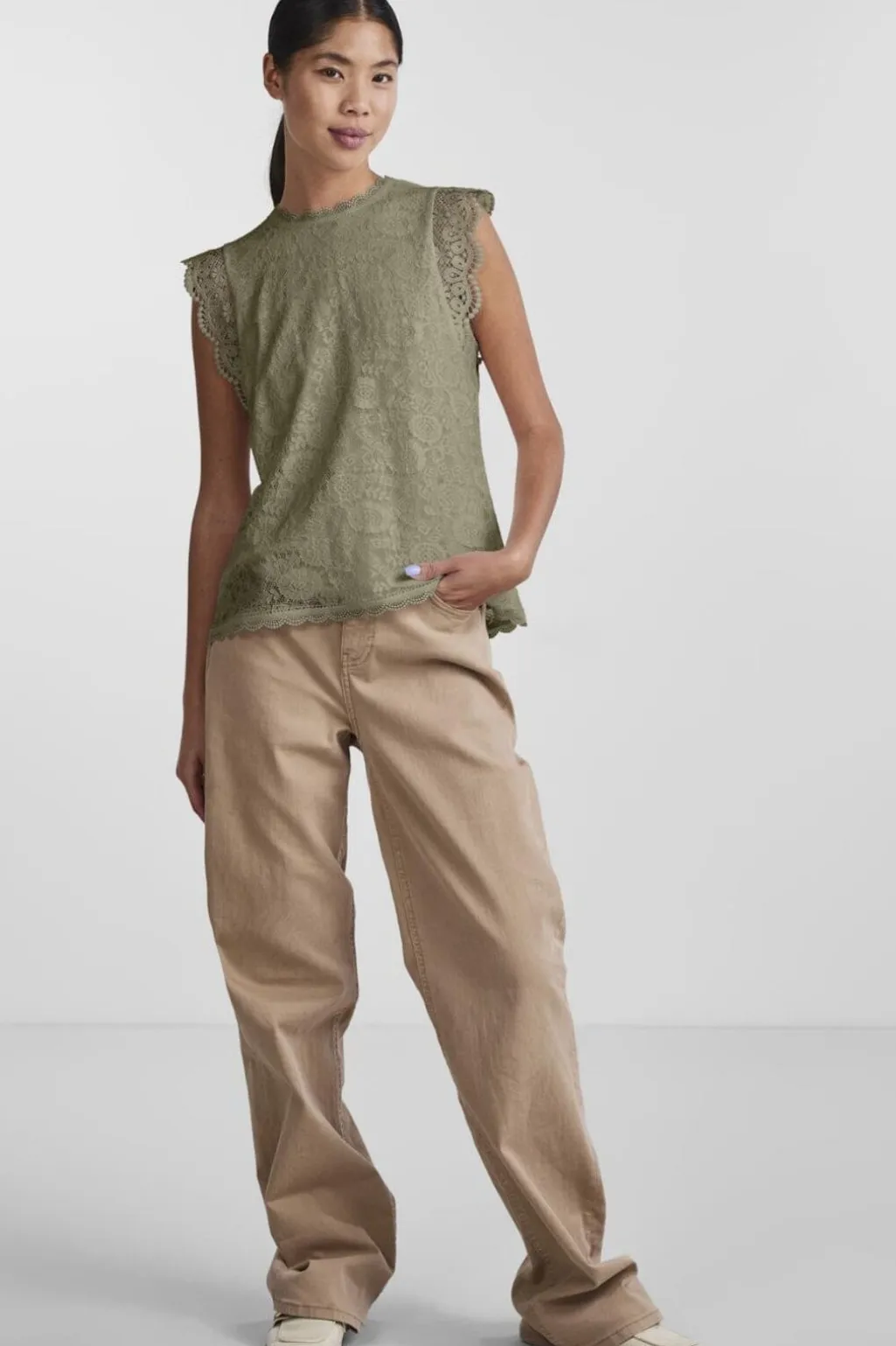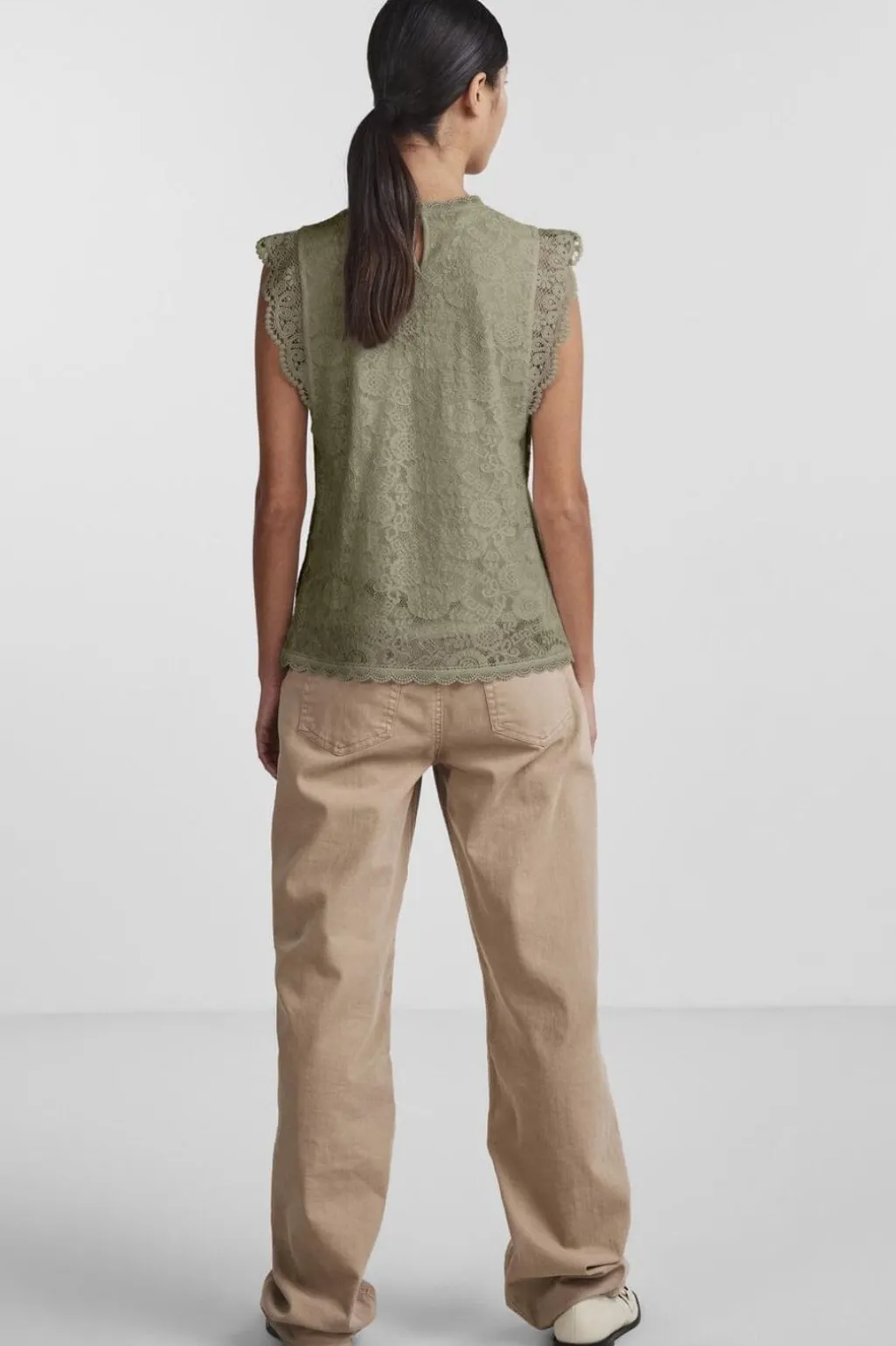 Ærmeløs blondetop fra Pieces i olivengrøn. Toppen har et blomstret blondemønster og rund hals med bølgede blondekanter.