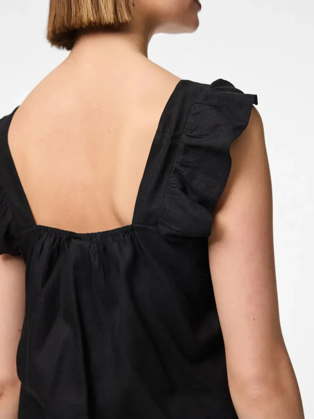 Sort top fra Pieces med flæseærmer og firkantet halsudskæring. Toppen er fremstillet i en blanding af viskose og hør, der giver en behagelig fornemmelse mod huden.