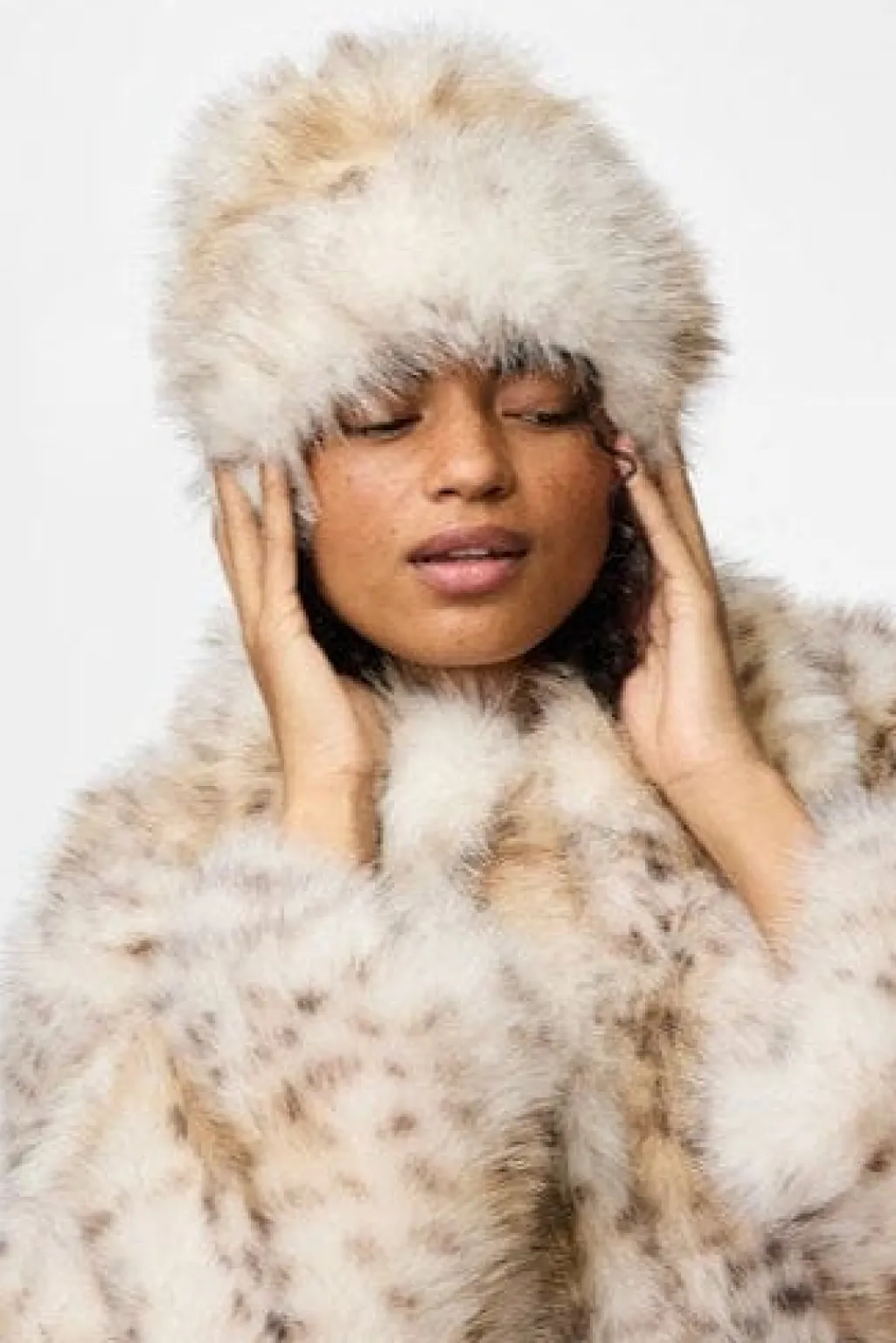 Hat fra Pieces med leopardlignende mønster i brune nuancer på en hvid og creme bund. Den fluffy tekstur giver hatten et blødt udtryk.