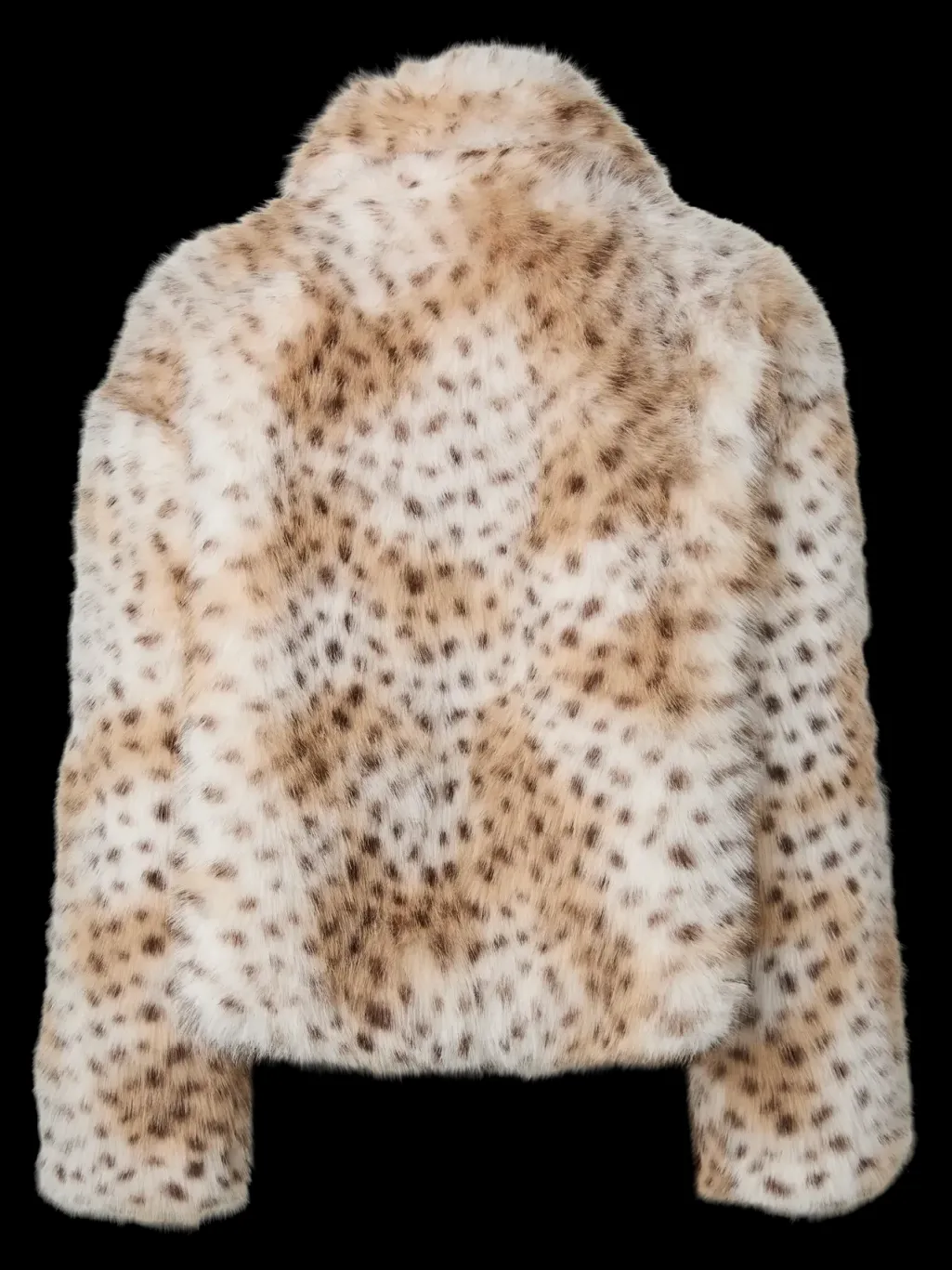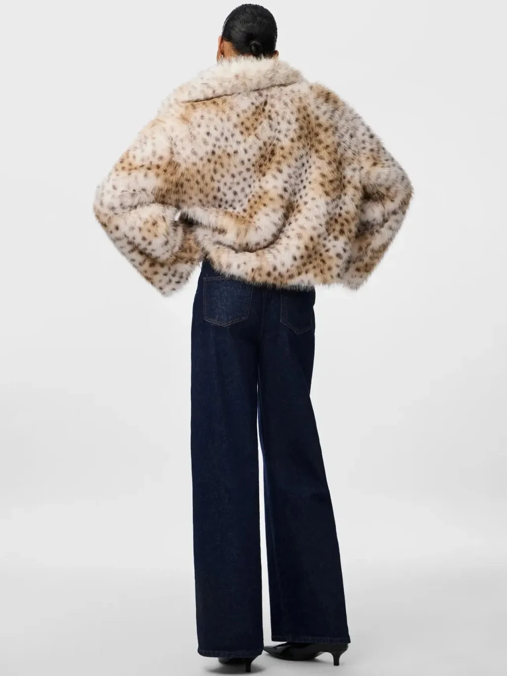 Kort fluffy jakke fra Pieces med leopardmønster på en lys cremefarvet bund. Jakken har en bred krave og en kort længde.