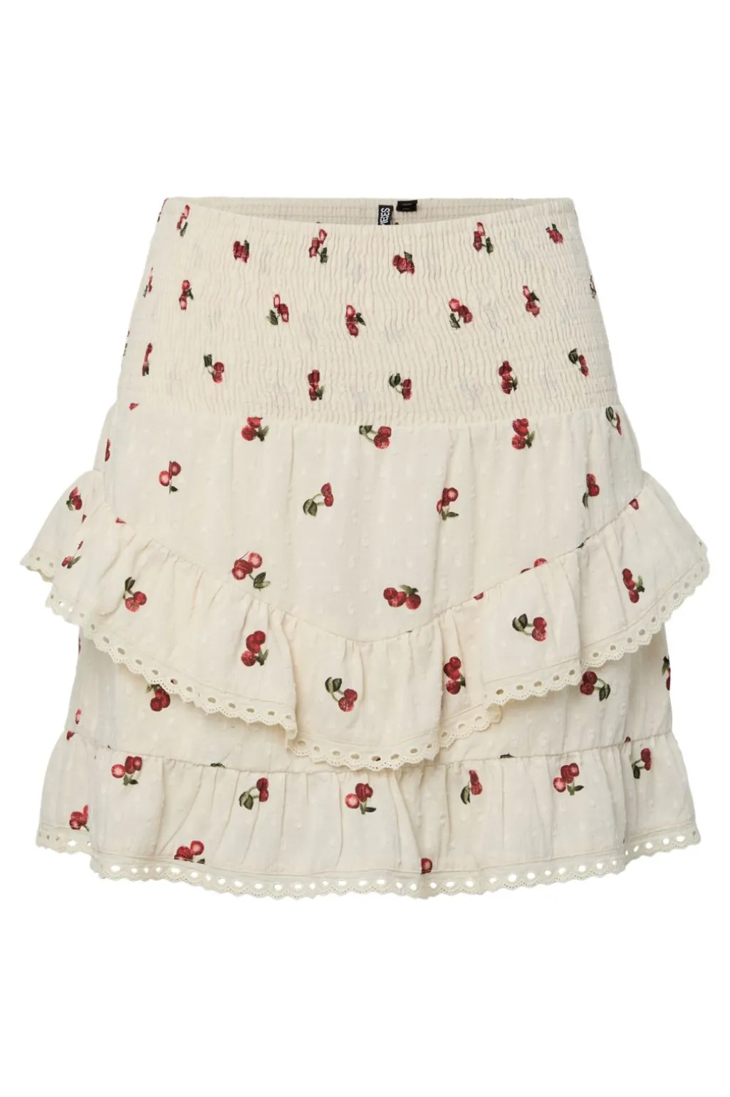 Kort smocknederdel fra Pieces i cremefarvet bomuld med et mønster af små røde kirsebær. Nederdelen har rynket talje og blondedetaljer langs flæserne i bunden.