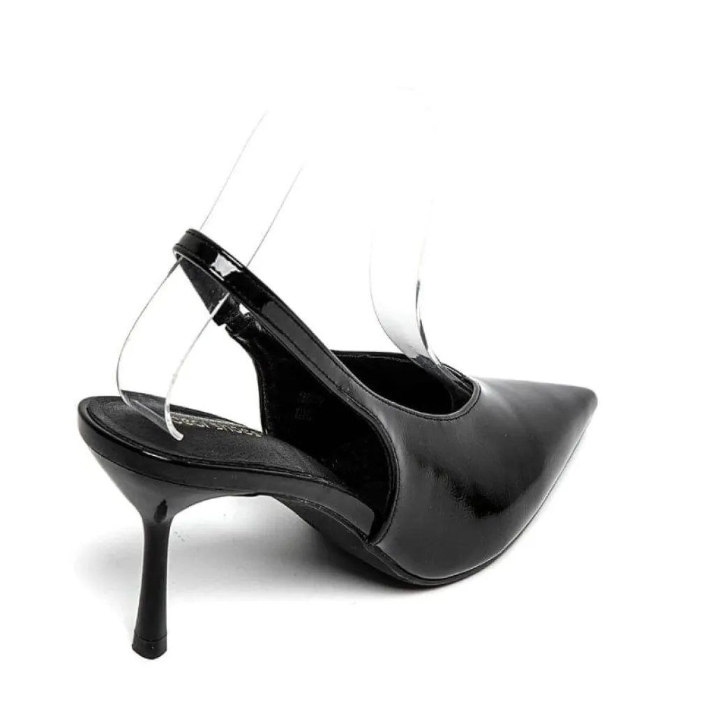 Sort stiletto fra Bloom med spids tå og slank hæl. Skoen har en skinnende overflade og elastisk lukning.