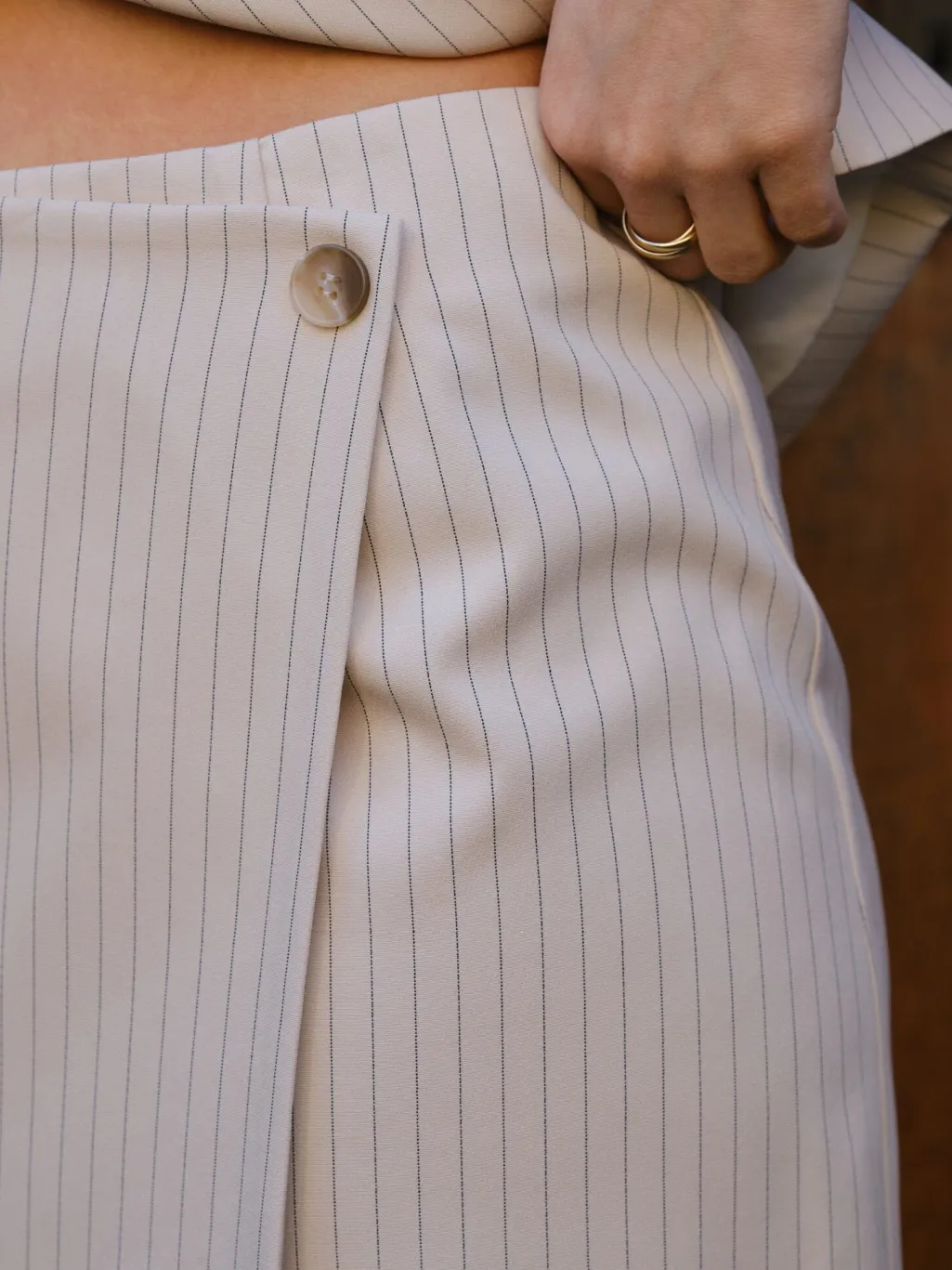 Nålestribet nederdel fra Neo Noir i sandfarvet stof med slå-om-design. Nederdelen har knapper og lynlås som lukning og går til midt på låret.
