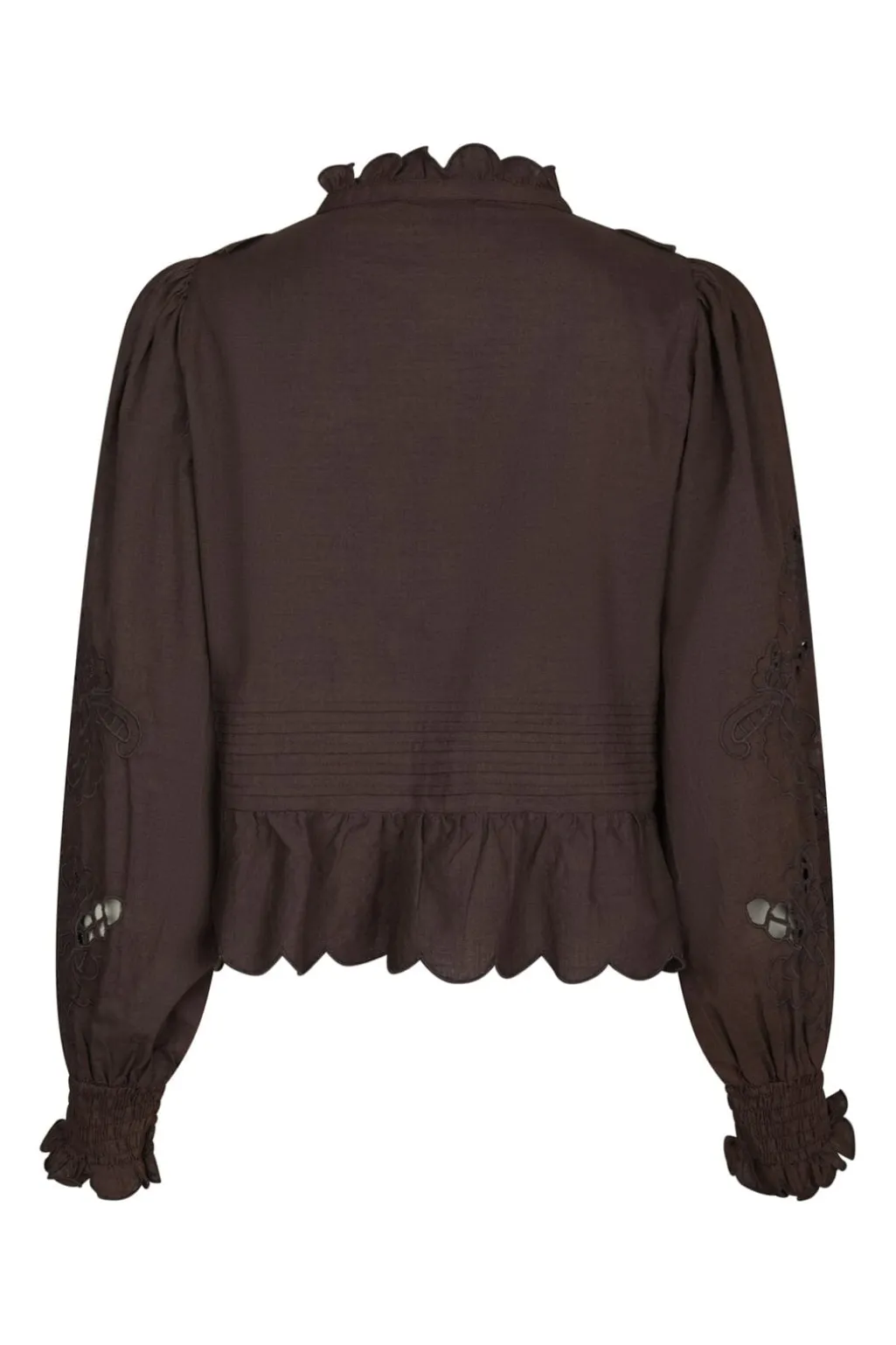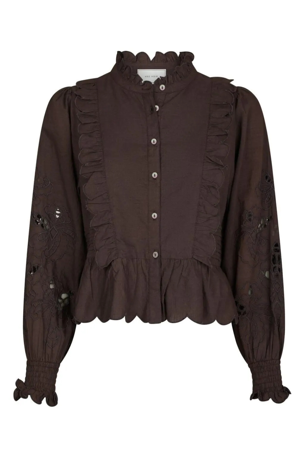 Mørkebrun bluse fra Neo Noir, lavet af 100 % bomuld. Blusen har en flæsekrave, broderede detaljer på ærmerne og knaplukning foran.