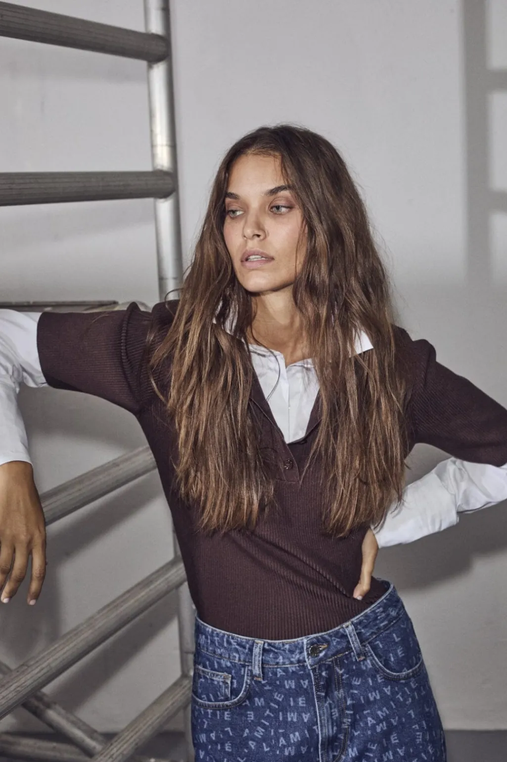 Ribstrikket polobluse fra Haute L’Amitié i en varm brun nuance. Blusen har korte ærmer og en polokrave med knaplukning.