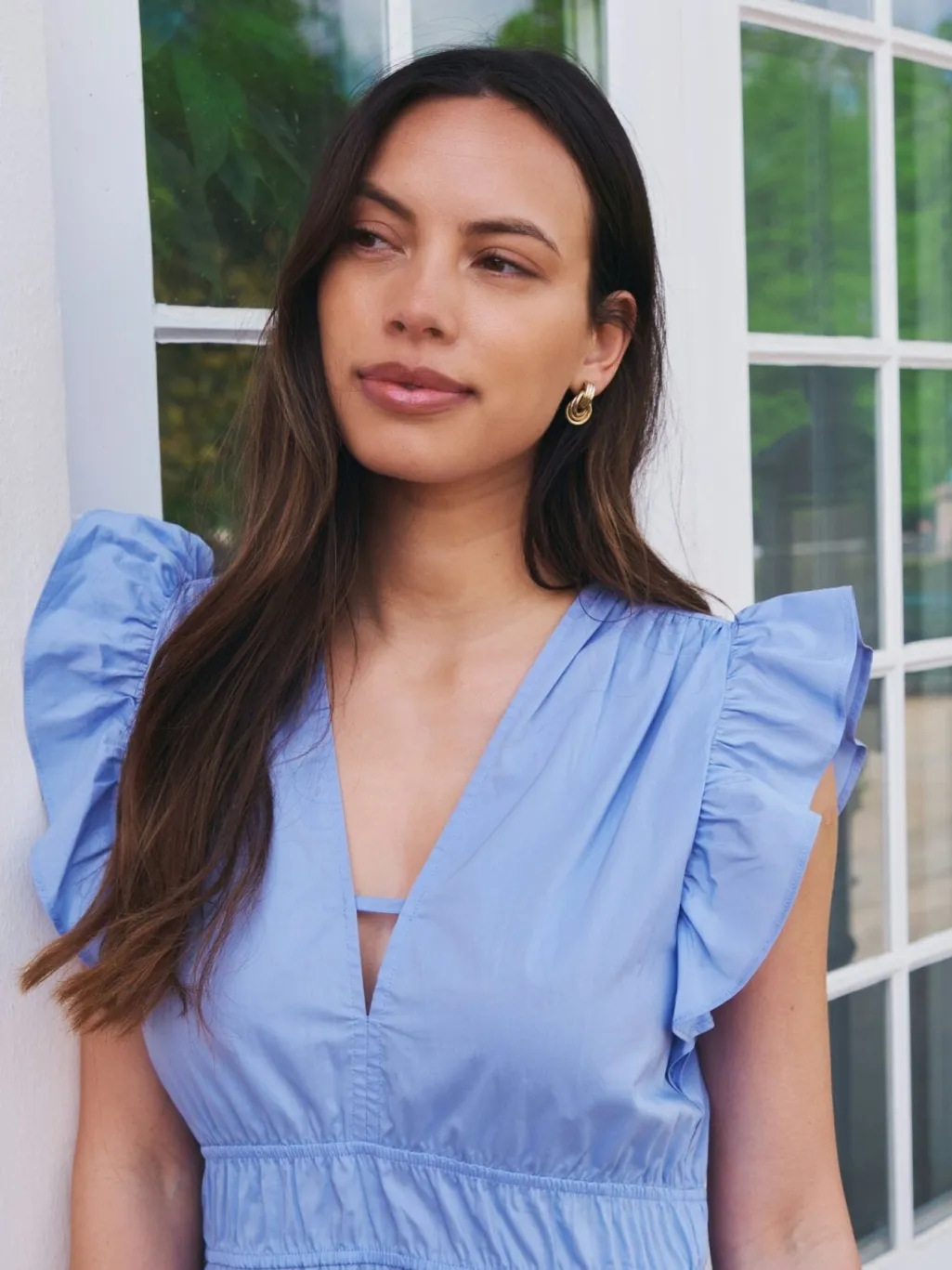 Lyseblå poplinkjole med flæser ved ærmerne og nederste kant. Den løse pasform med elastik i taljen skaber en behagelig silhuet, mens V-udskæringen giver et feminint udtryk.