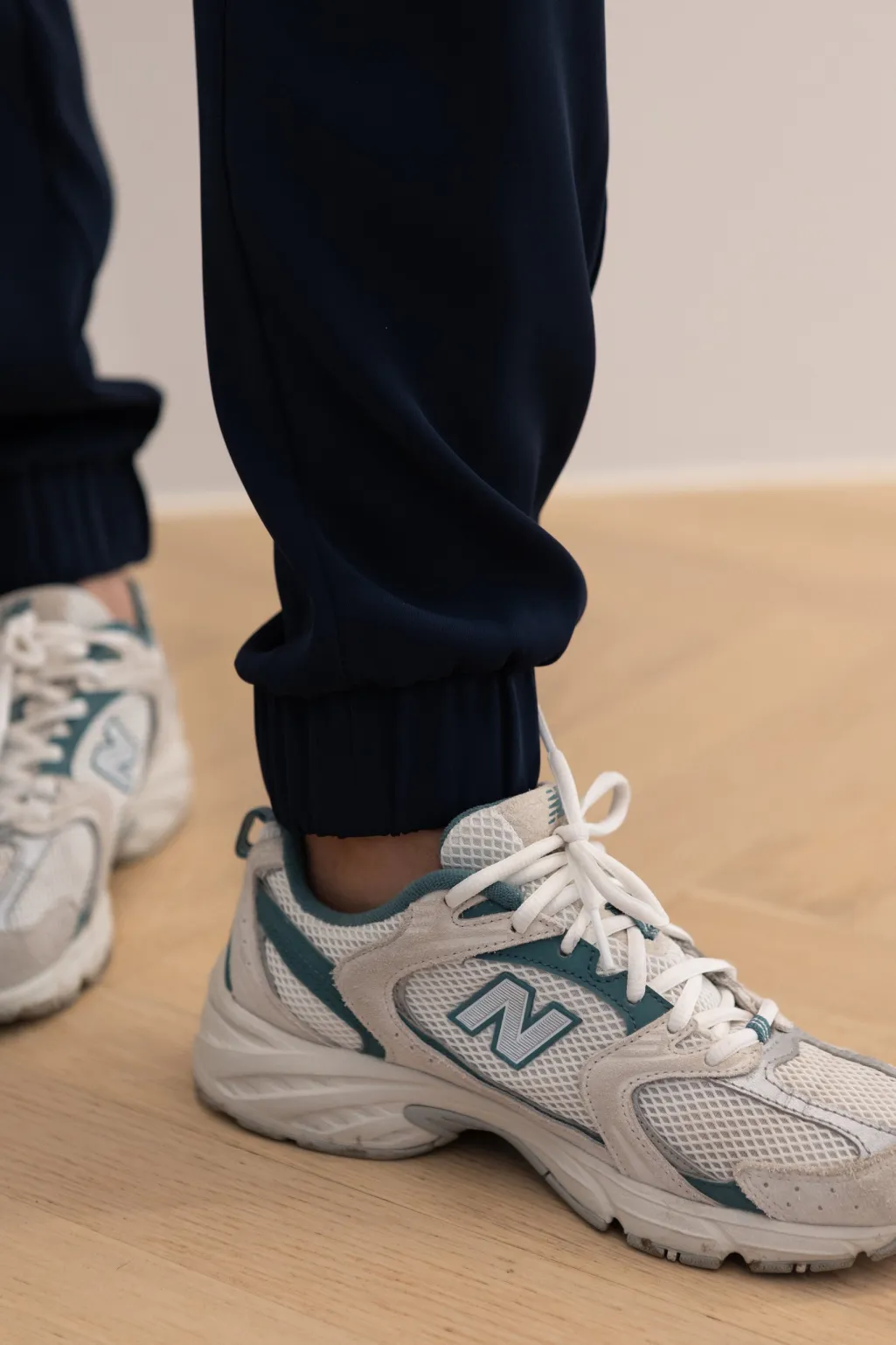 Mørkeblå bukser fra Valentin Studio med draperinger foran og elastik i taljen. Bukserne har praktiske forlommer og dekorative baglommer, der giver dem et afslappet udtryk.