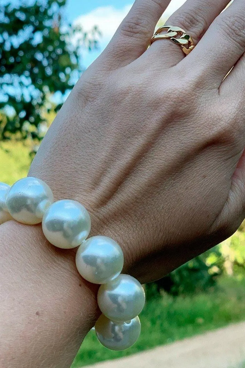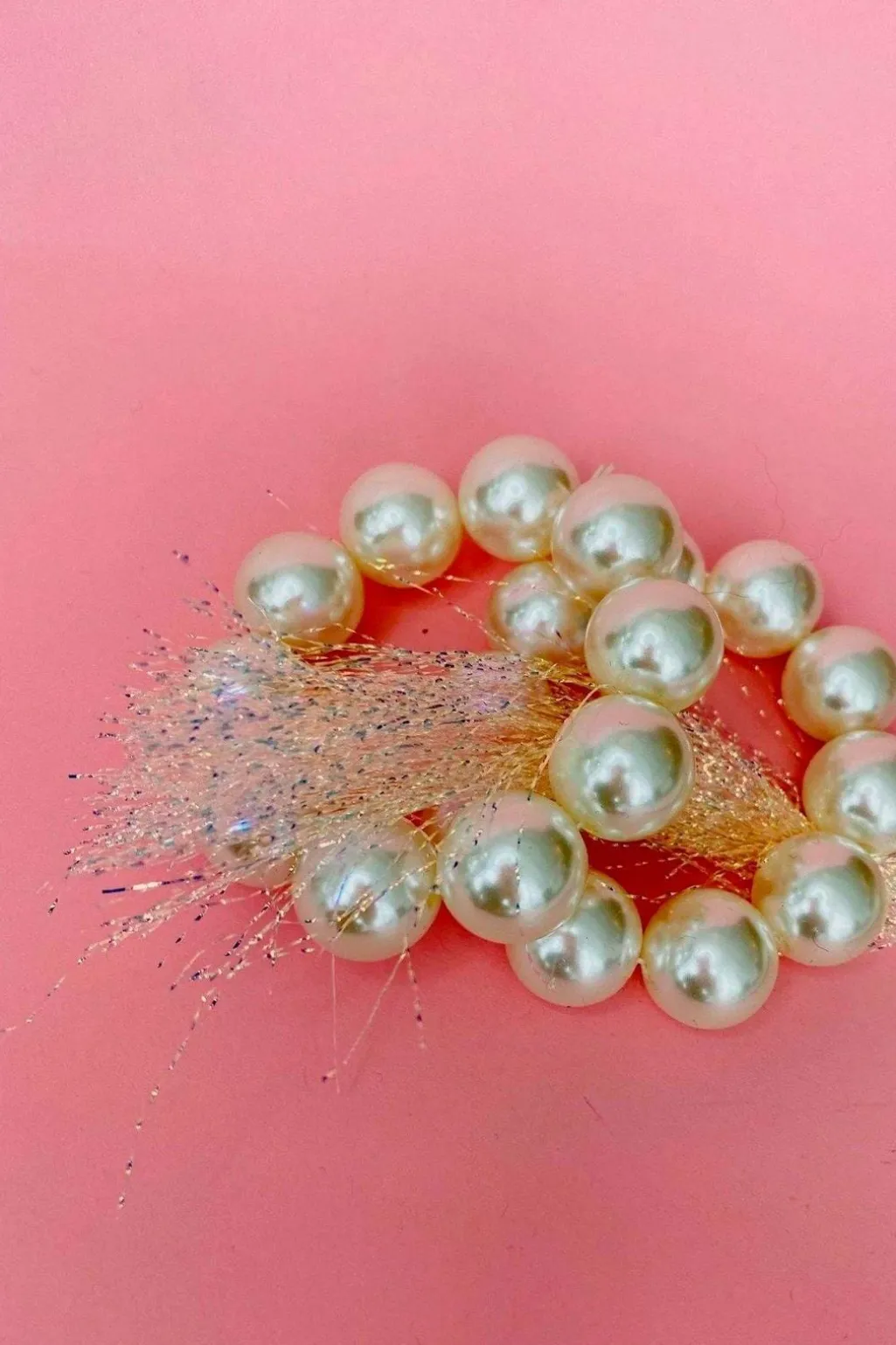 Pynteelastik fra Mellow Moon med store perler i hvid og cream farver. Den har lav elasticitet og er designet til at sættes over en almindelig hårelastik.