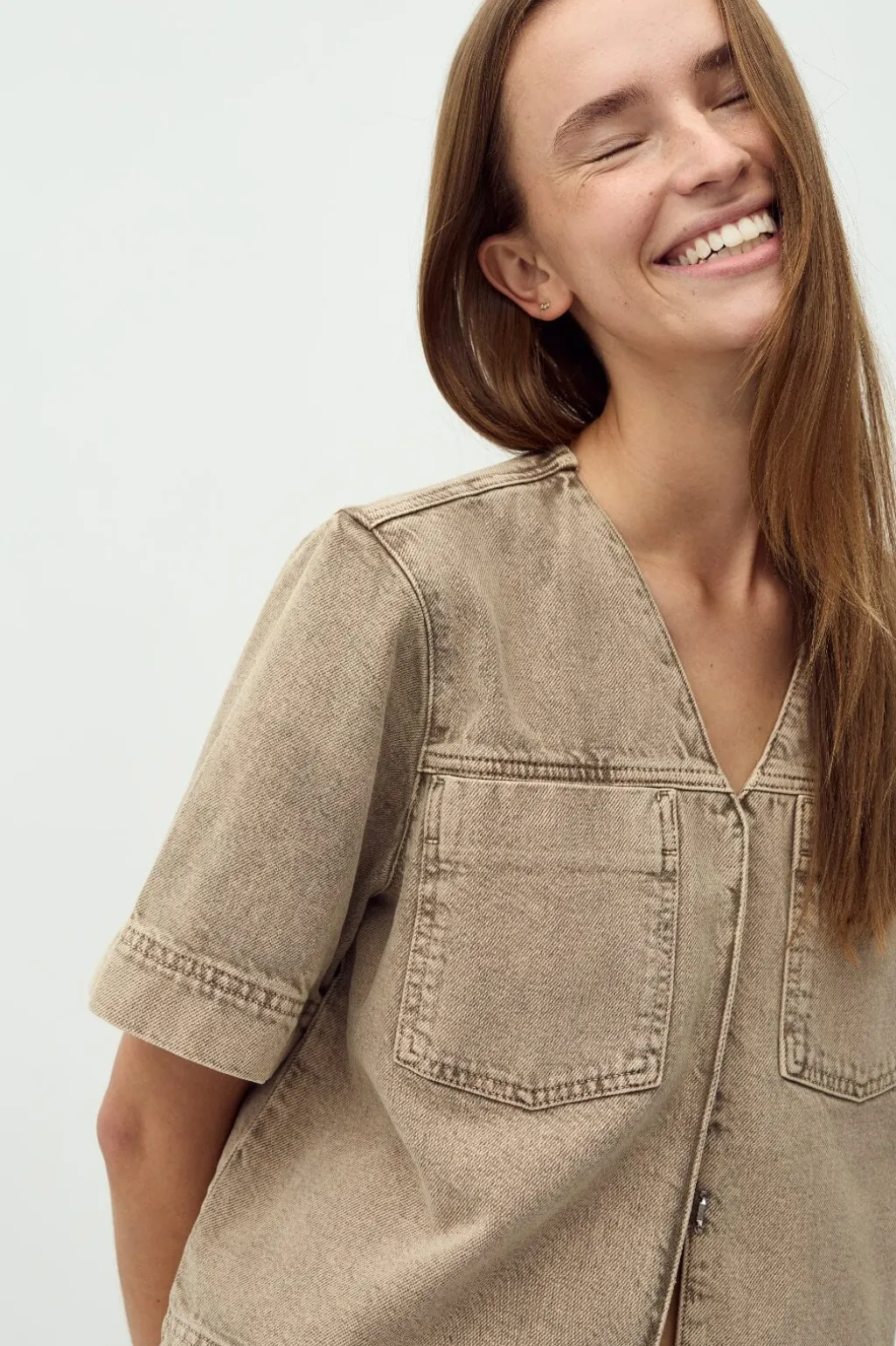 Beige denimskjorte fra MbyM med cropped design. Skjorten har en V-halsudskæring og to brystlommer, kombineret med korte ærmer og dekorative syninger.
