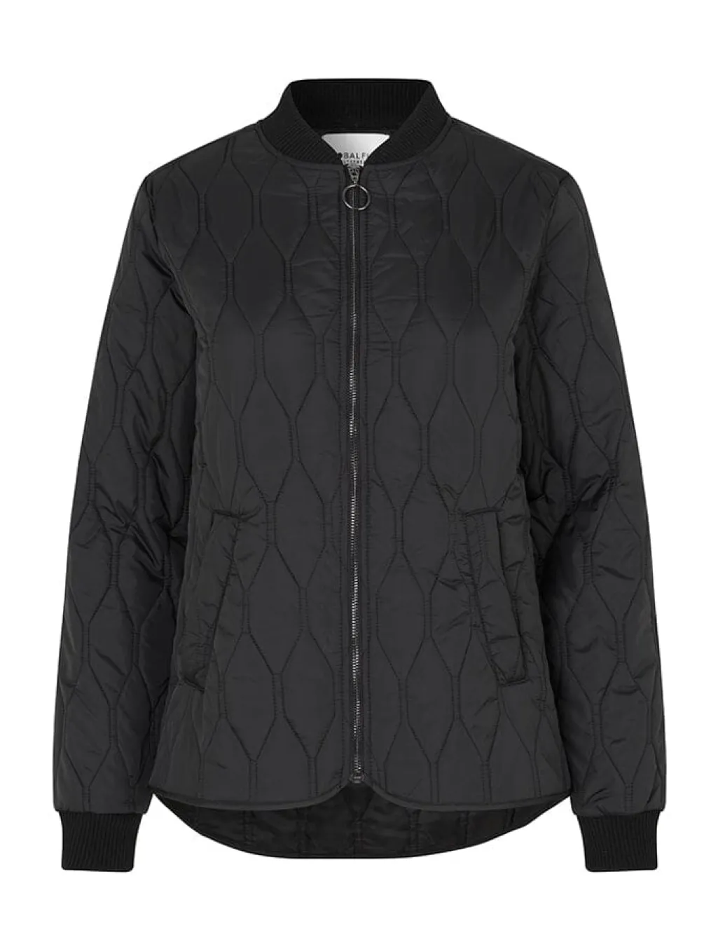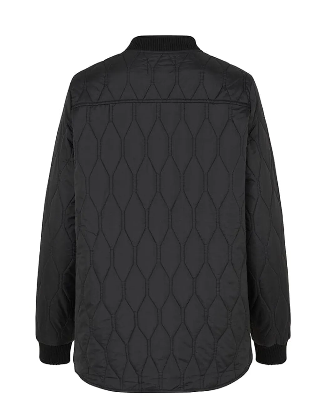Sort termojakke fra Global Funk med quiltet diamantmønster. Jakken har lynlåslukning foran og ribkant ved krave og manchetter, hvilket giver den et sporty udtryk.