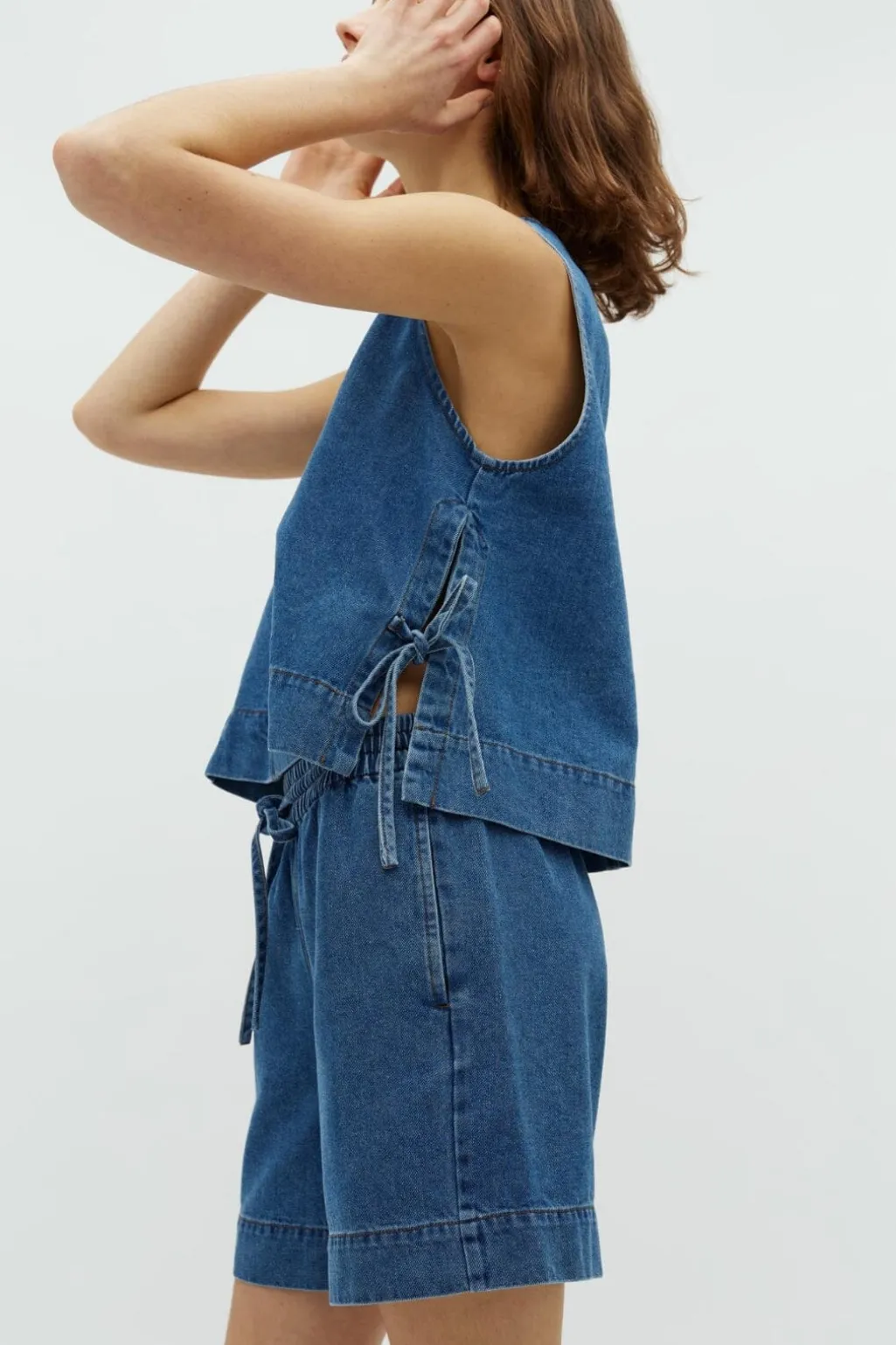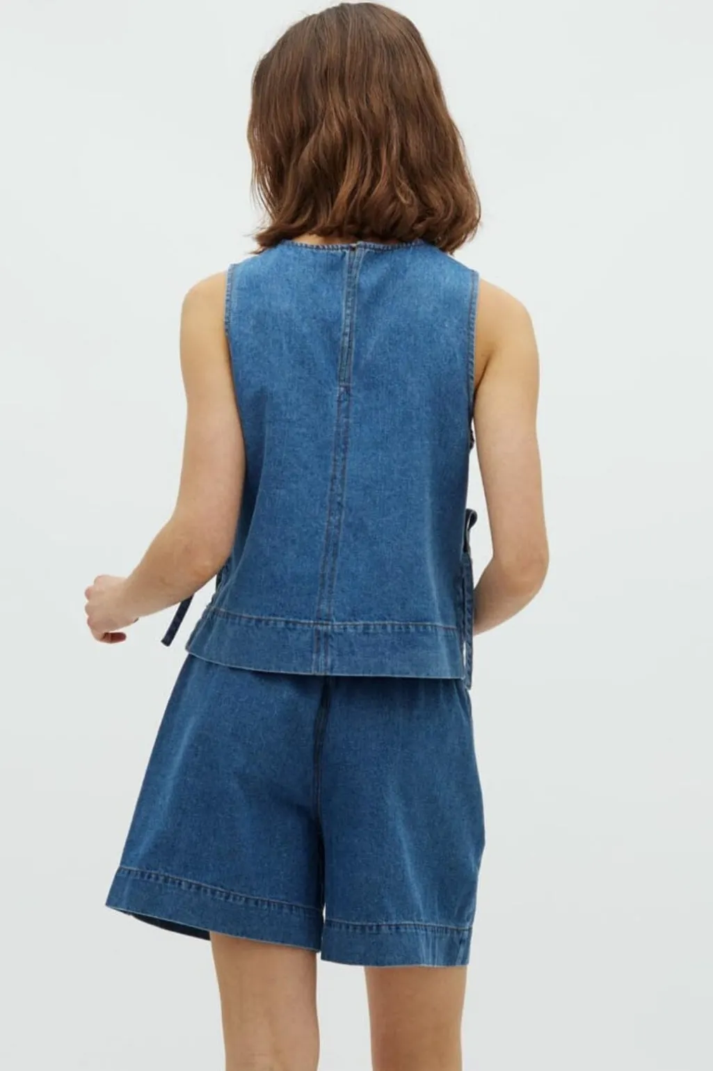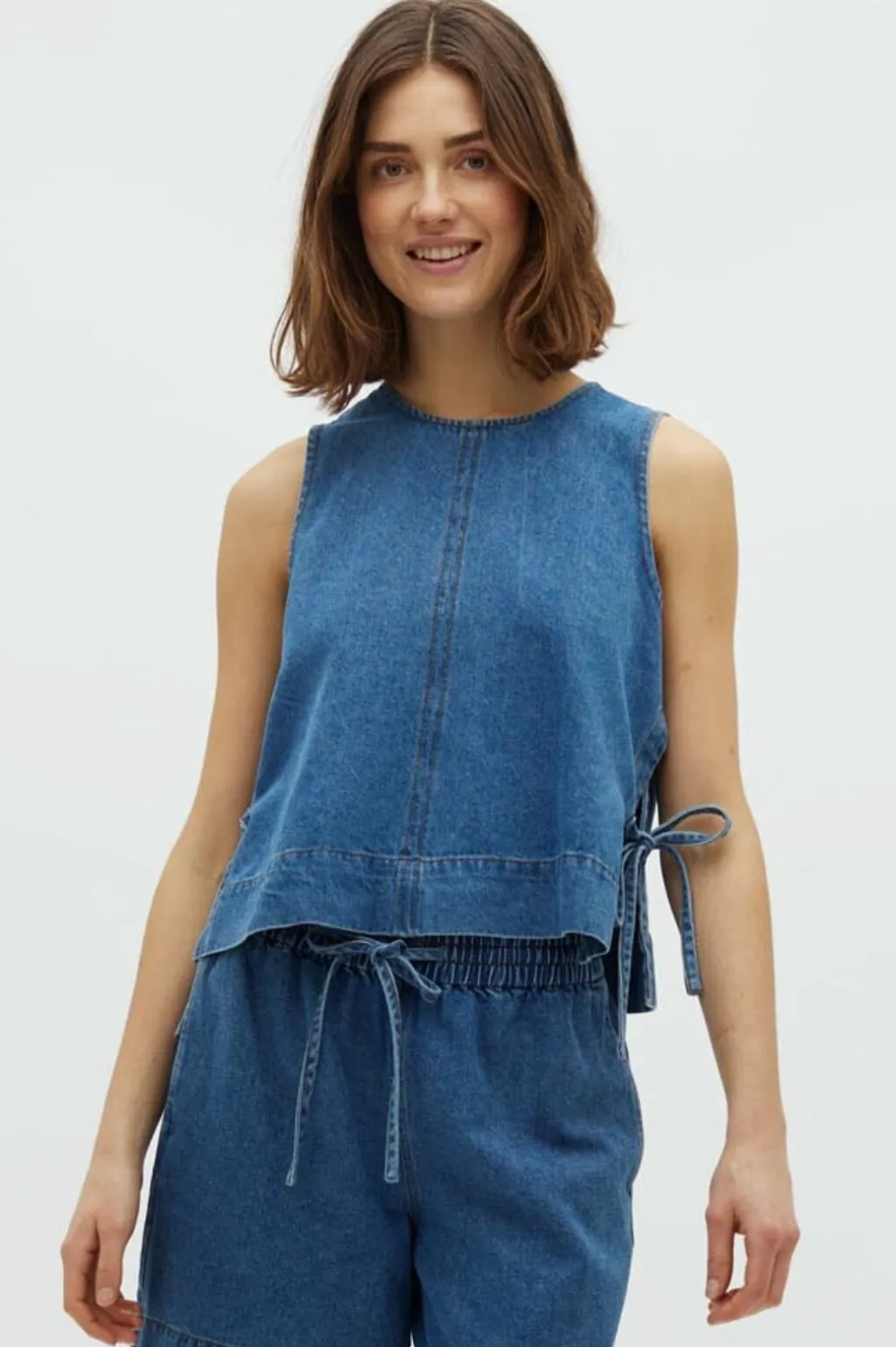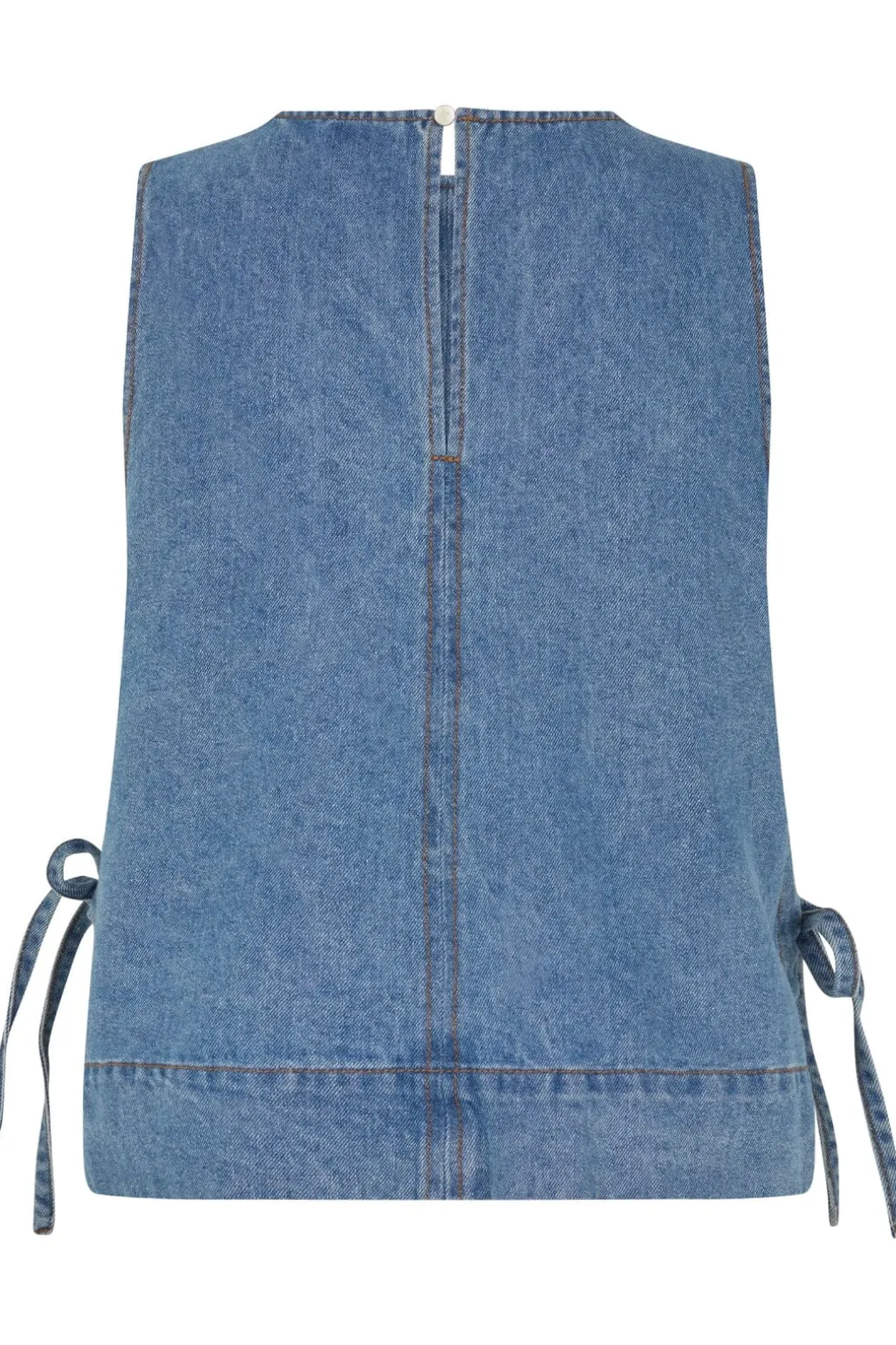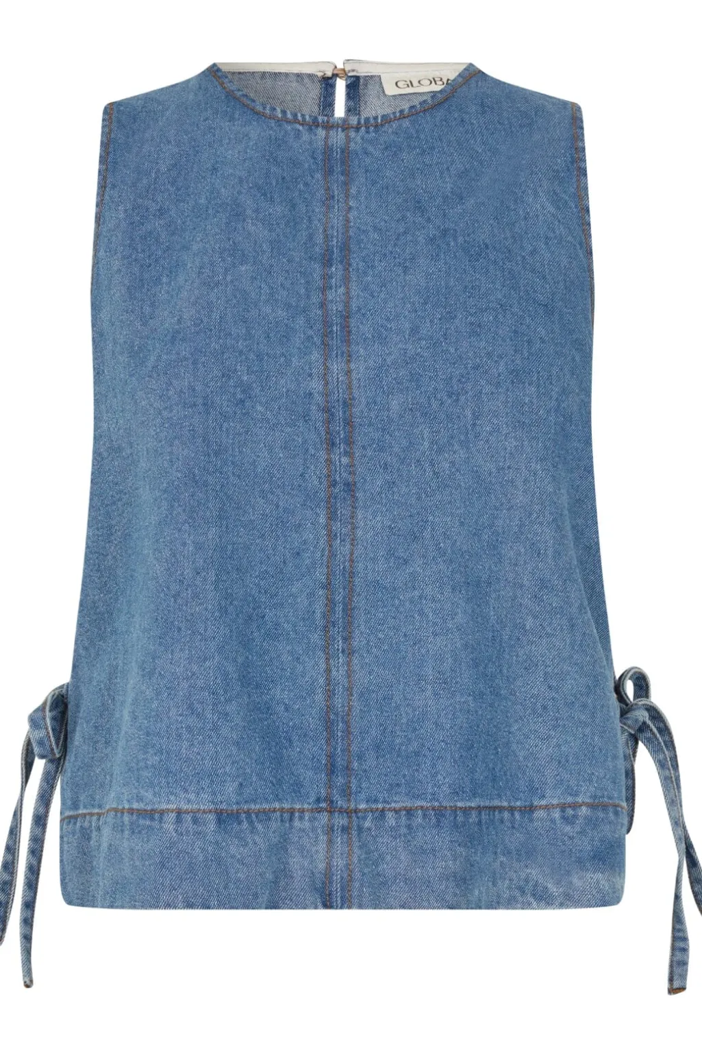 Ærmeløs denimtop fra Global Funk i en mellem vintage blå nuance. Toppen har en rund halsudskæring og dekorative syninger med bindebånd i siderne.