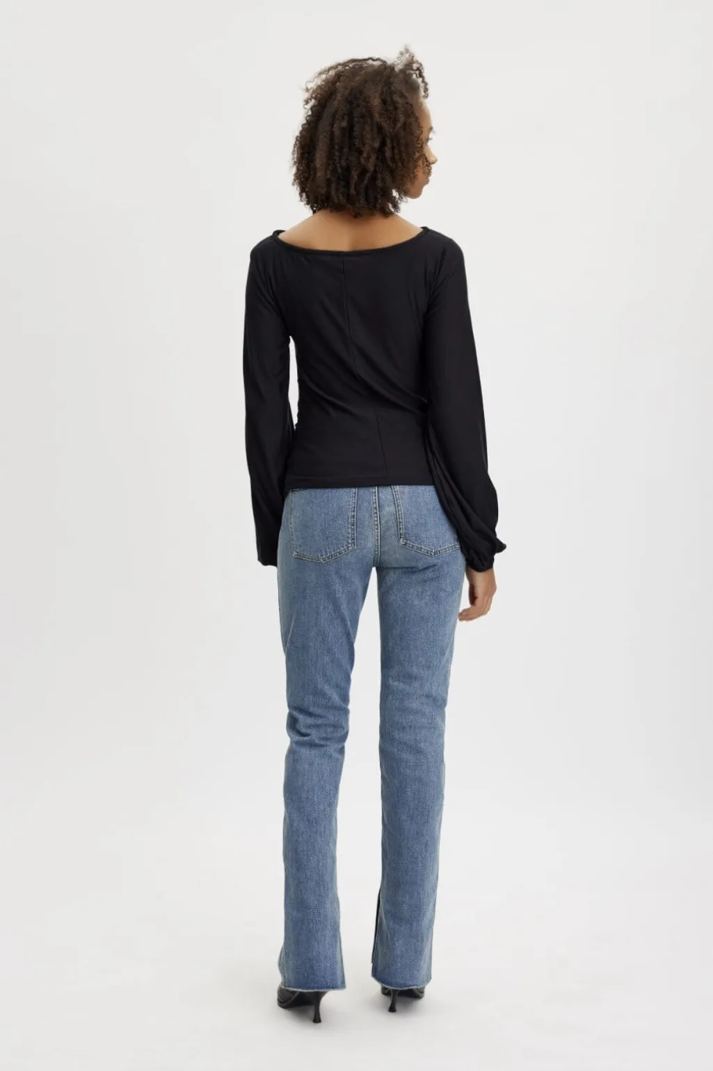 Sort bluse med ballonærmer og firkantet halsudskæring. Blusen har rynkeeffekt på forsiden og elastik ved ærmerne, hvilket skaber en god pasform.