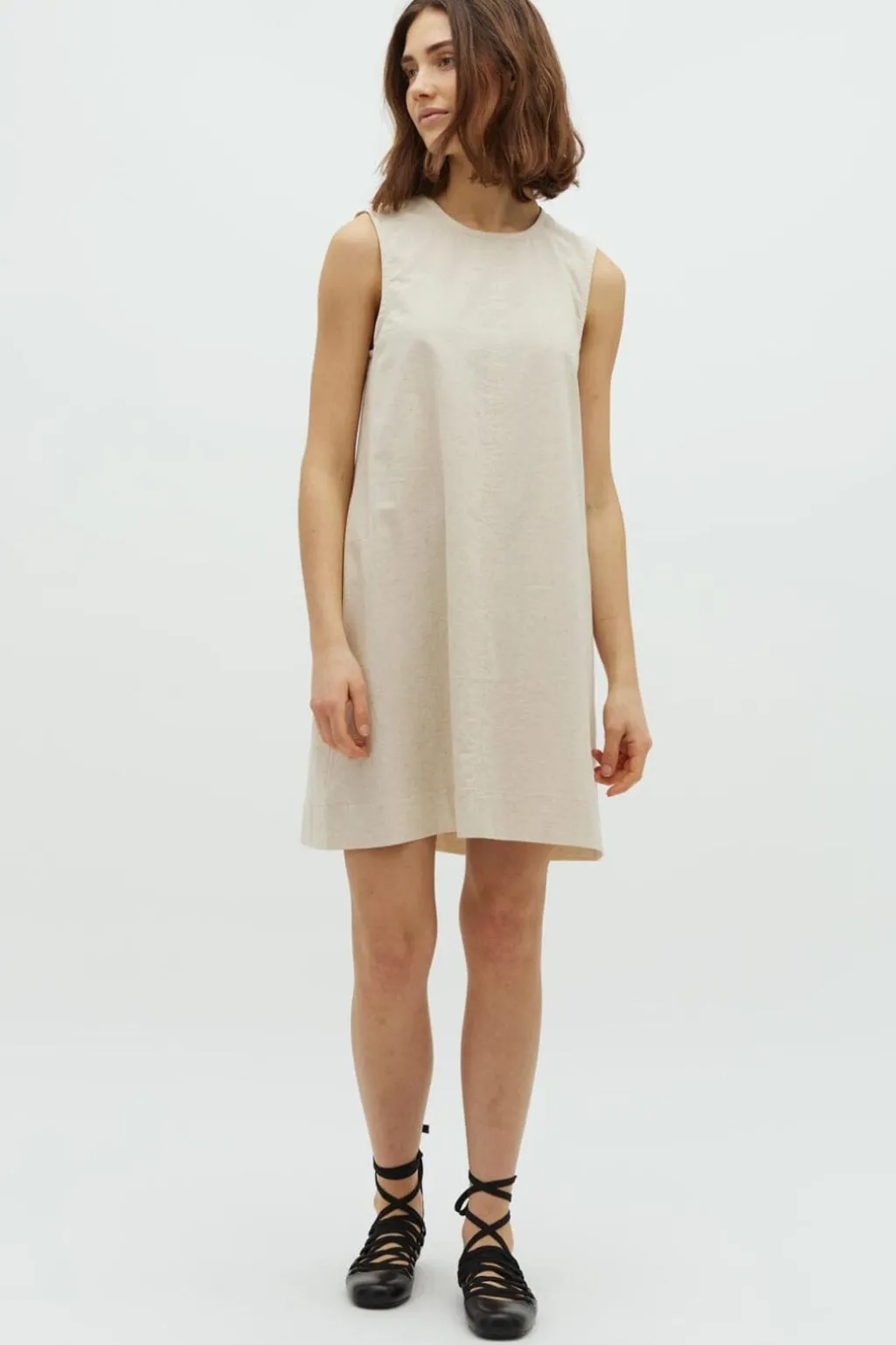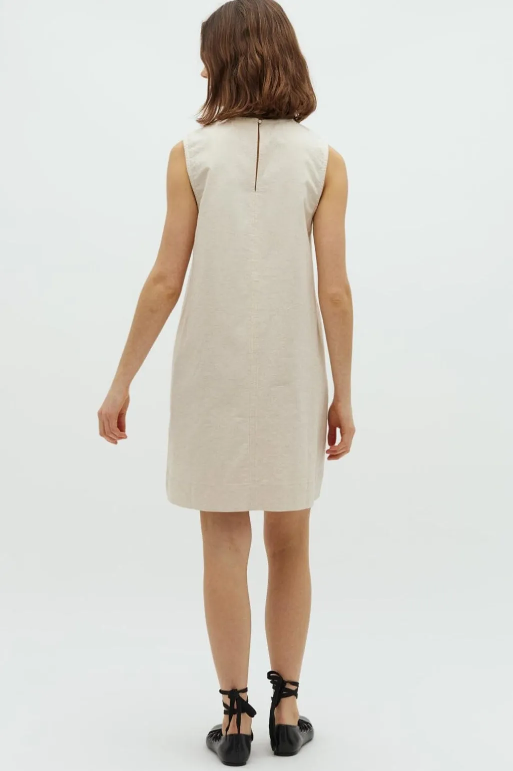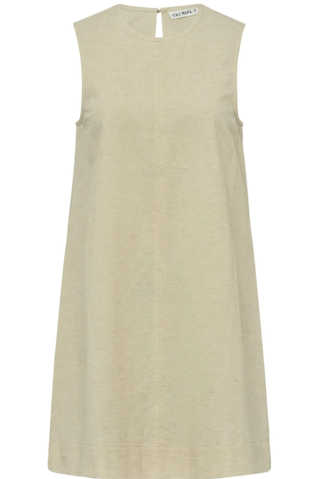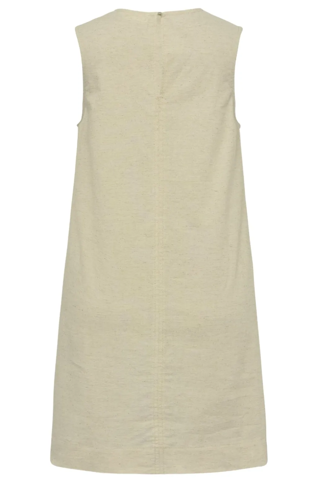 Ærmeløs kjole i farven Natural Linen med lige snit. Kjolen har rund hals og en lille nøglehulsåbning med knap bagpå. De dekorative syninger giver et enkelt udtryk.
