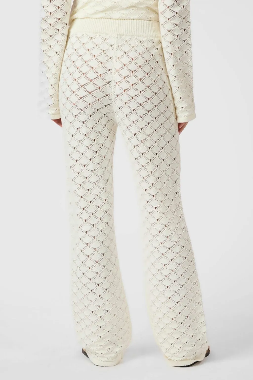 Hæklede bukser fra Neo Noir i off-white. Bukserne har et karakteristisk diamantmønster og en bred benvidde med gulvlang længde.