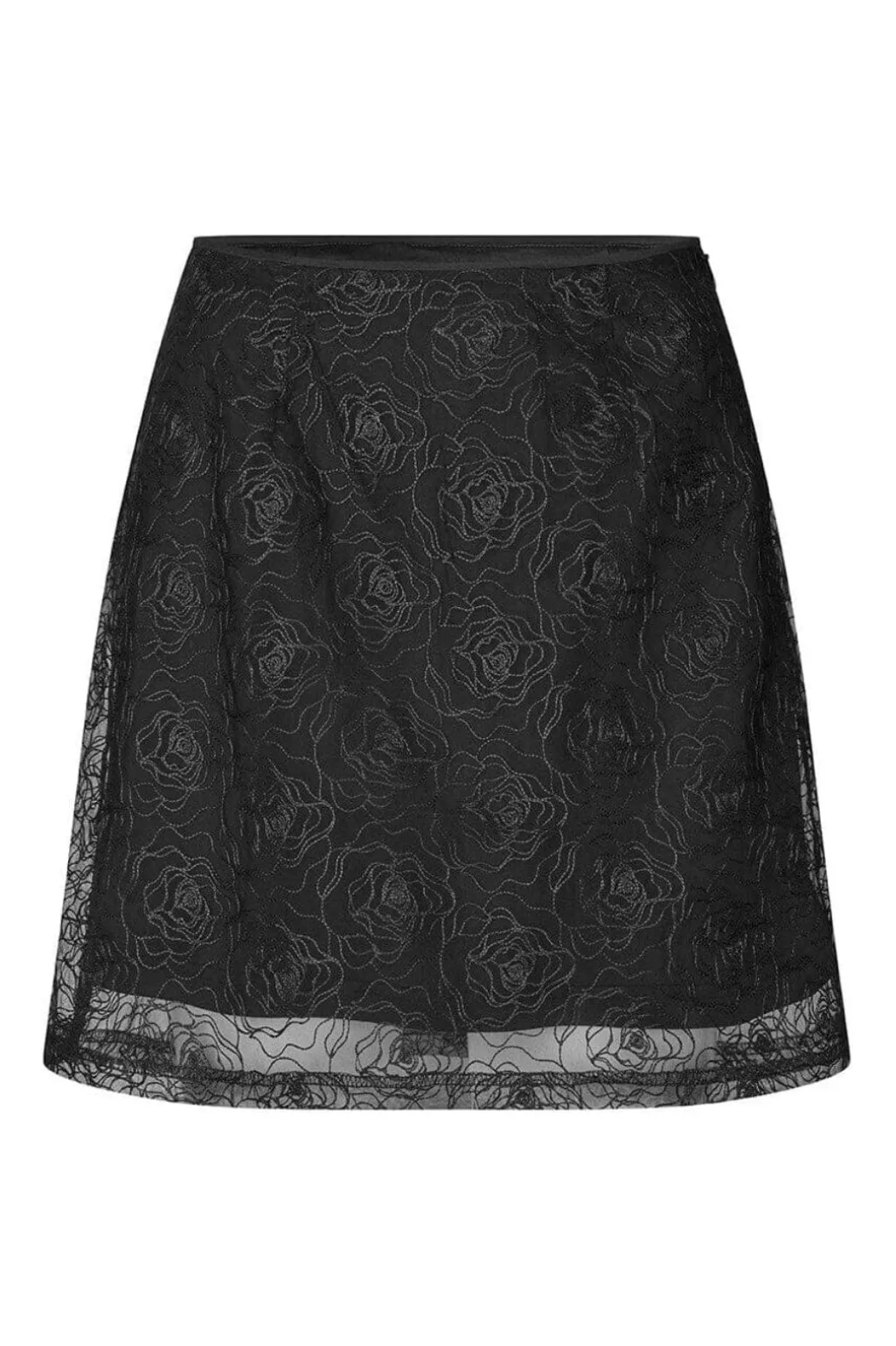 Sort nederdel fra Modström med broderet blomstermønster i gennemsigtigt stof. Den A-formede silhuet og lynlåslukning gør den praktisk at tage på og af.