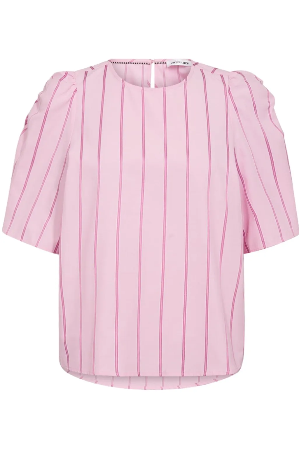 Lyserød stribet bluse fra Co´Couture med puffede ærmer. Blusen har rund halsudskæring og knaplukning i nakken. De lodrette striber på den lyserøde baggrund skaber et rent udtryk.
