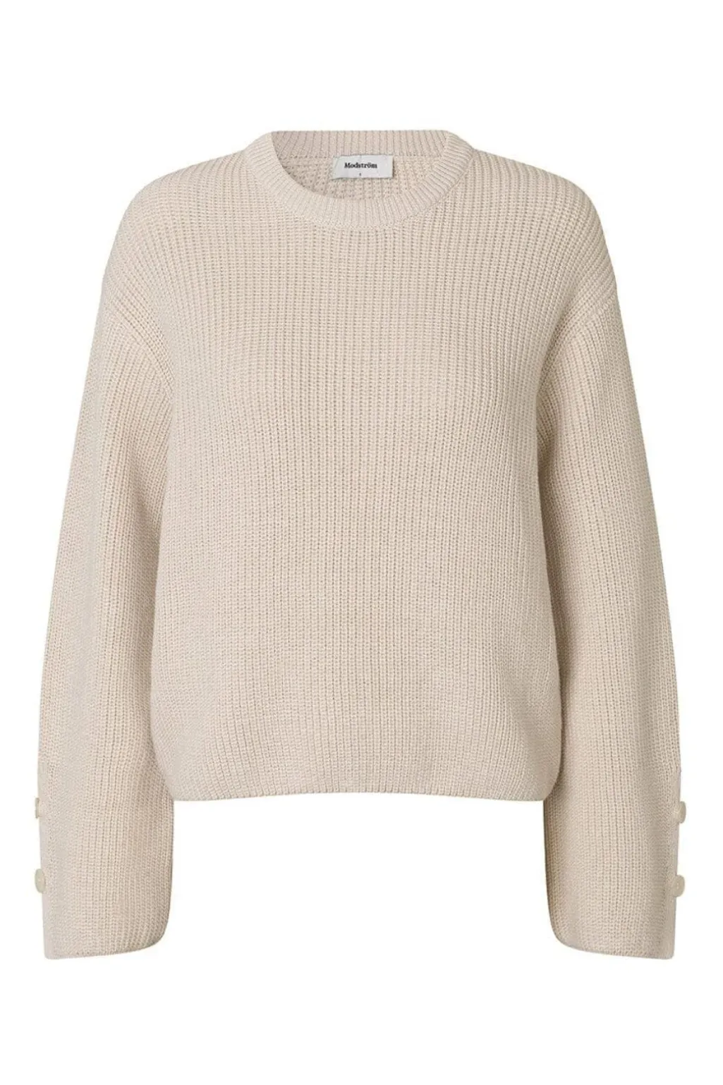 Striktrøje fra Modström i en varm cremefarve. Lavet af økologisk bomuld med en tydelig strikstruktur og knapper på ærmerne.