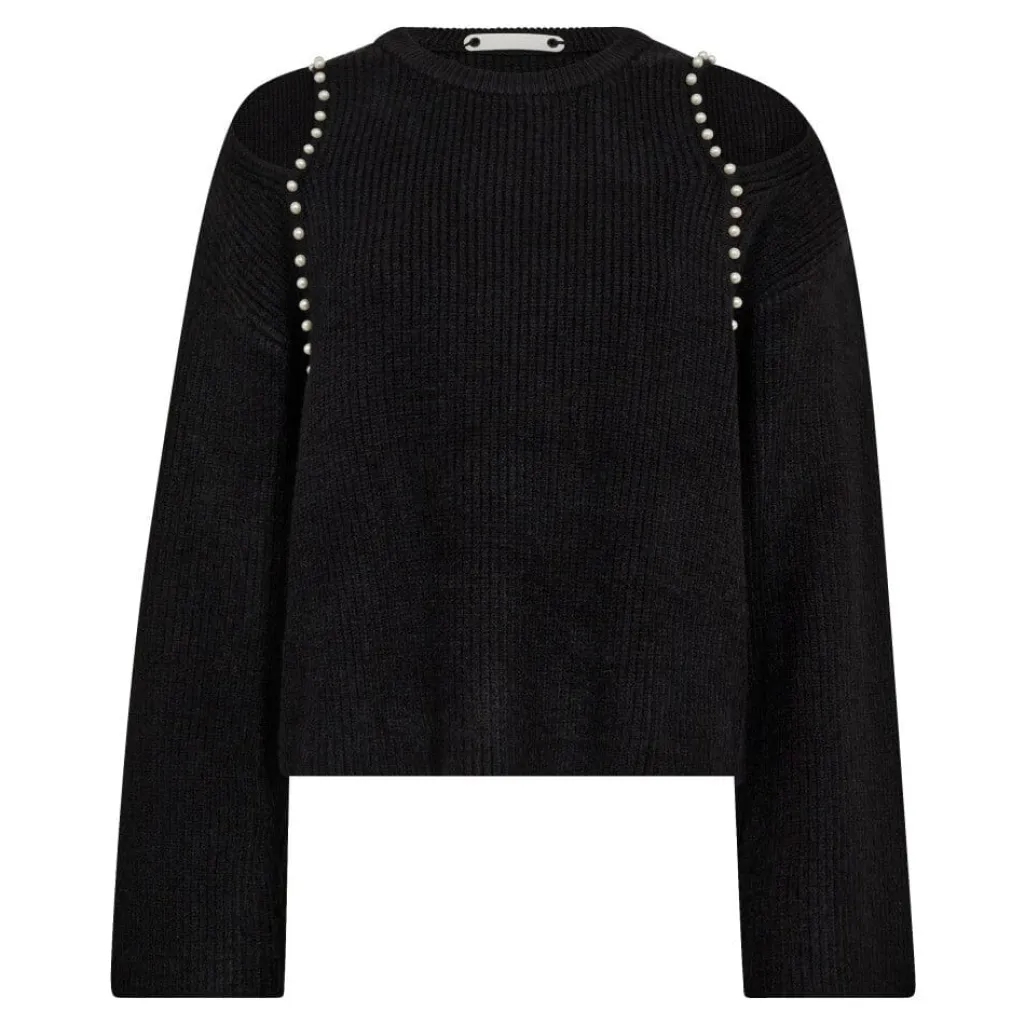 Sort striktrøje fra Co´Couture med ribbet tekstur. Trøjen har perleudsmykning på skuldrene og lange ærmer, hvilket gør den velegnet til både hverdag og festlige lejligheder.