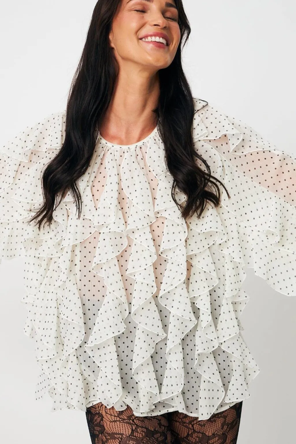 Hvid bluse fra Cras med små prikker over det hele. Blusen har flere lag flæser både foran og på ærmerne, rund halsudskæring samt knapper i nakken og ved manchetterne.