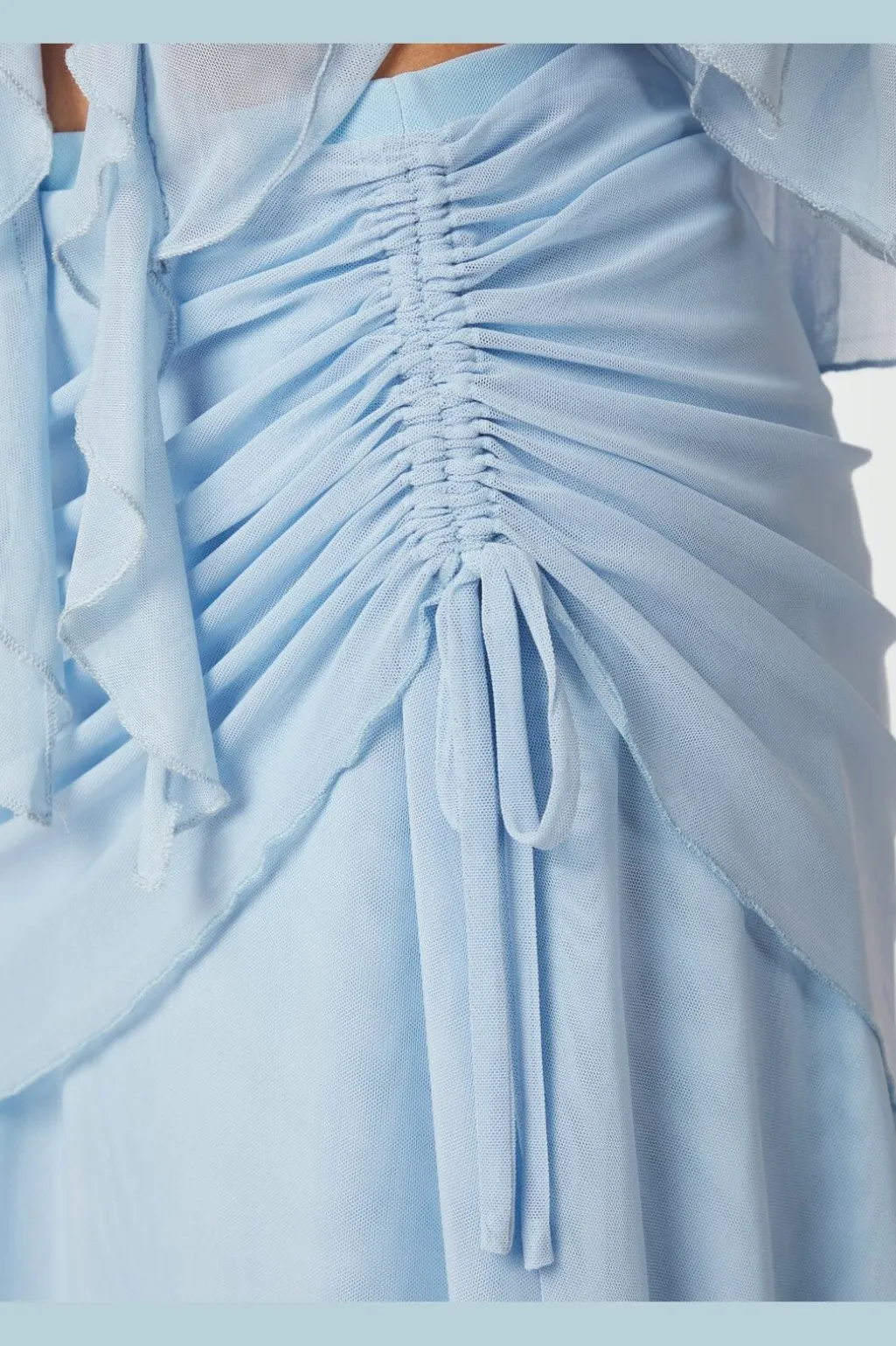 Lys blå mesh-nederdel fra Neo Noir med asymmetrisk snit. Nederdelen har flere lag stof, der falder i bløde folder, og en justerbar snøre i taljen.