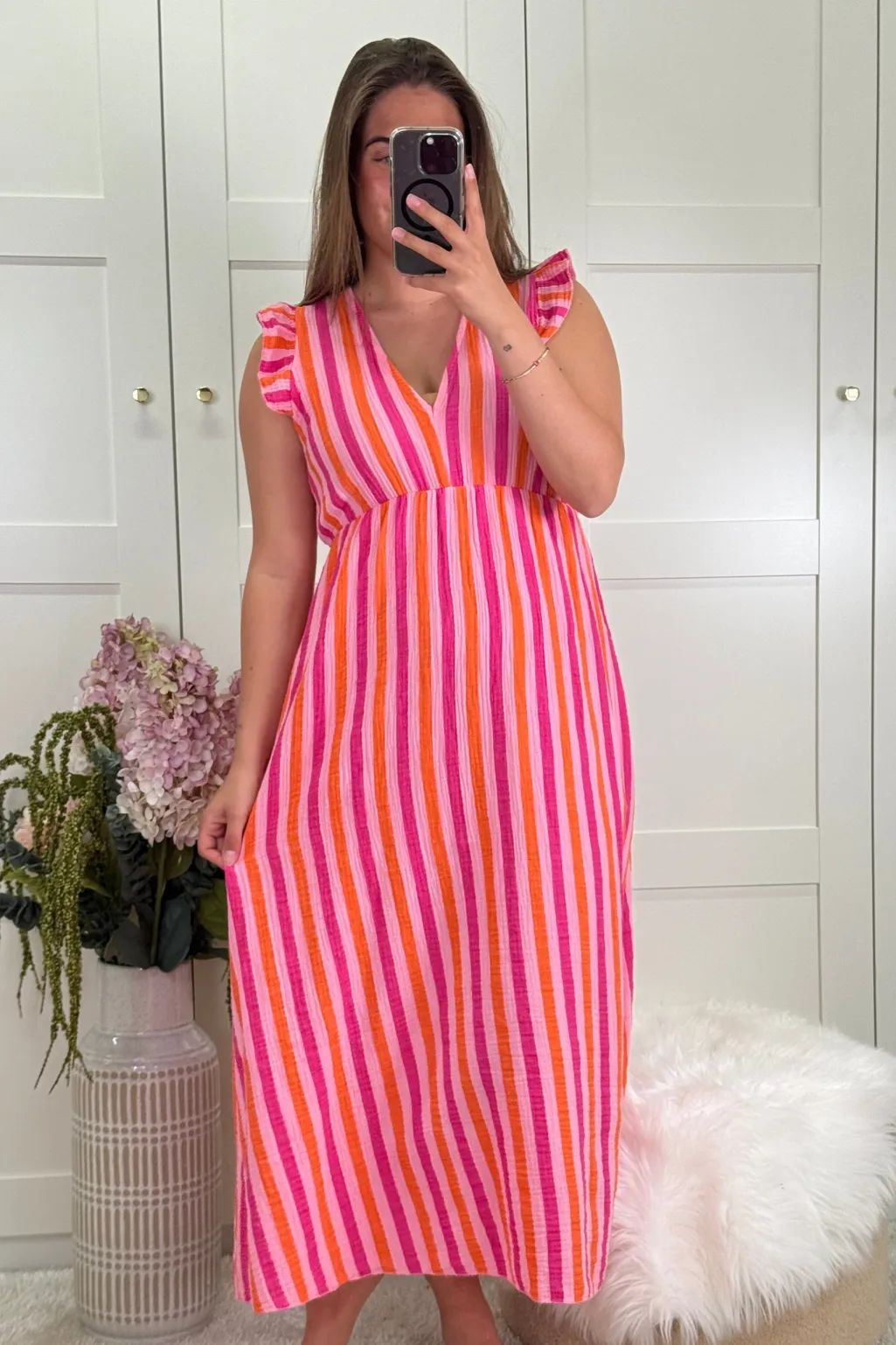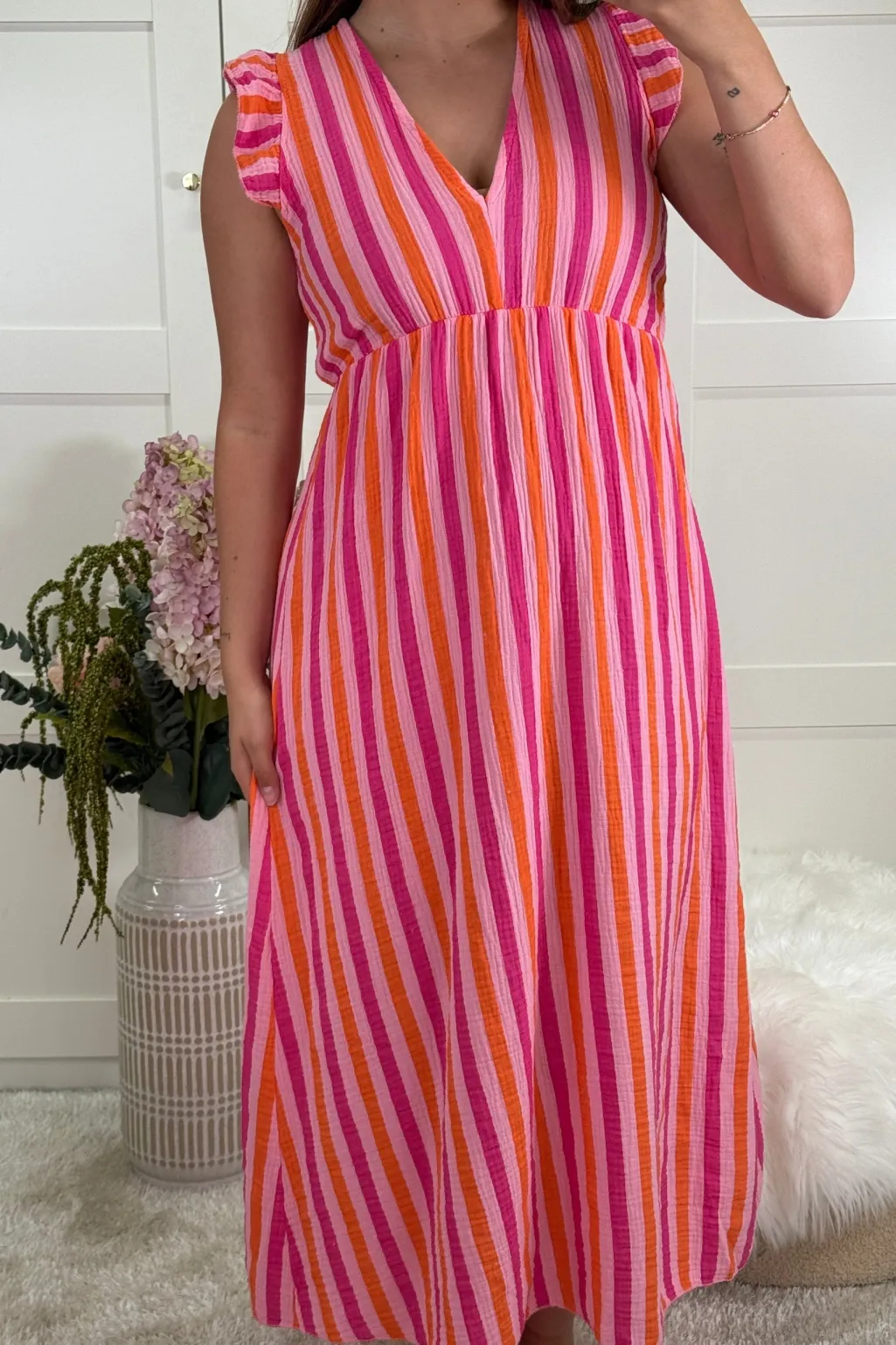Stribet ankellang kjole fra A-bee i pink og orange. Kjolen har flæseærmer og V-udskæring. Den er lavet i et let og luftigt bomuldsstof med vertikale striber.