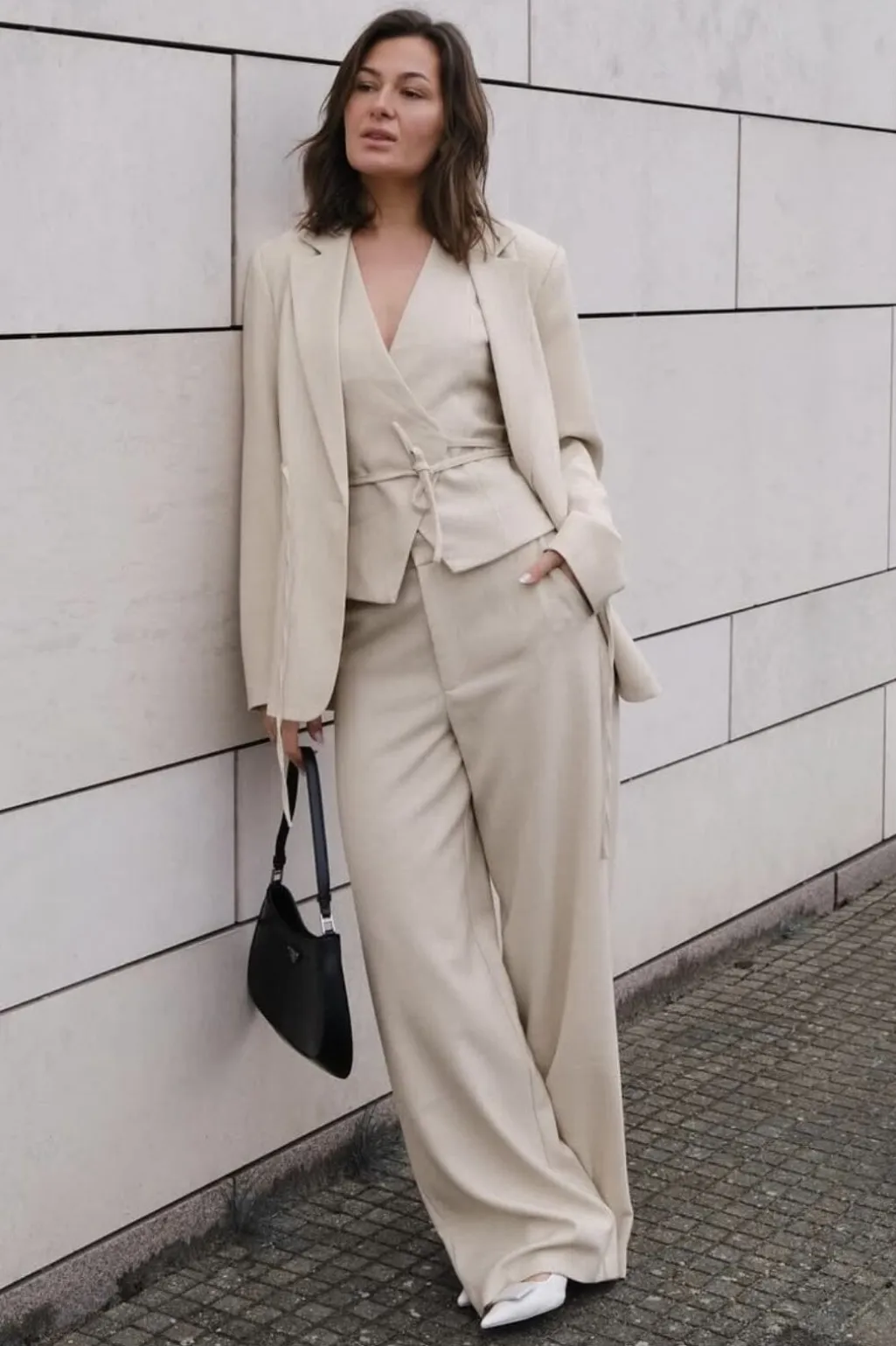 Beige melange vest med wrap-design og bindebånd i taljen. Den har V-udskæring og er ærmeløs med en meleret overflade, der giver dybde til stoffet.