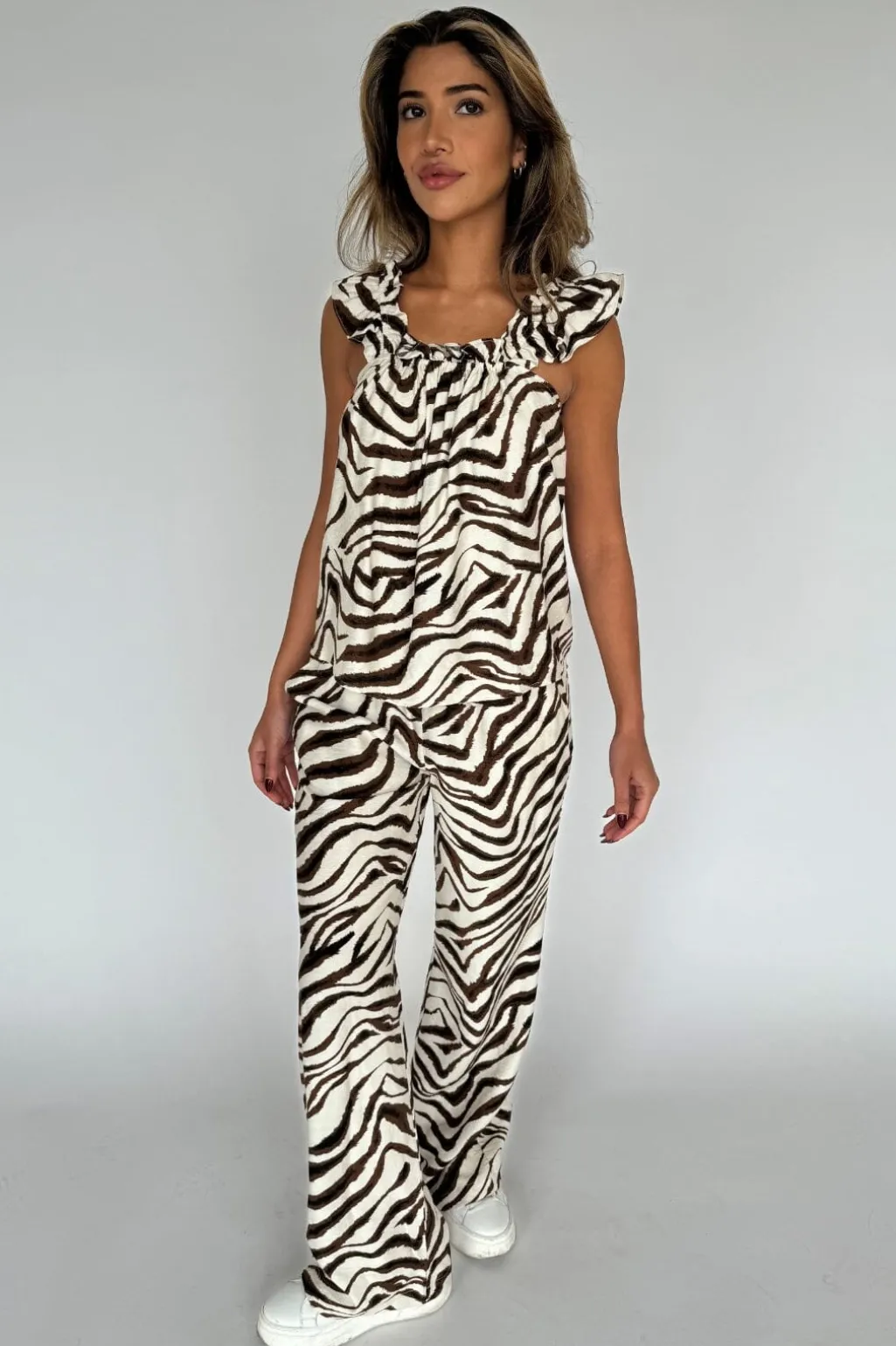 Continue top i zebramønster med brunt og hvidt print. Toppen har flæsedetaljer og en Peter Pan-krave, der giver den et feminint udtryk.