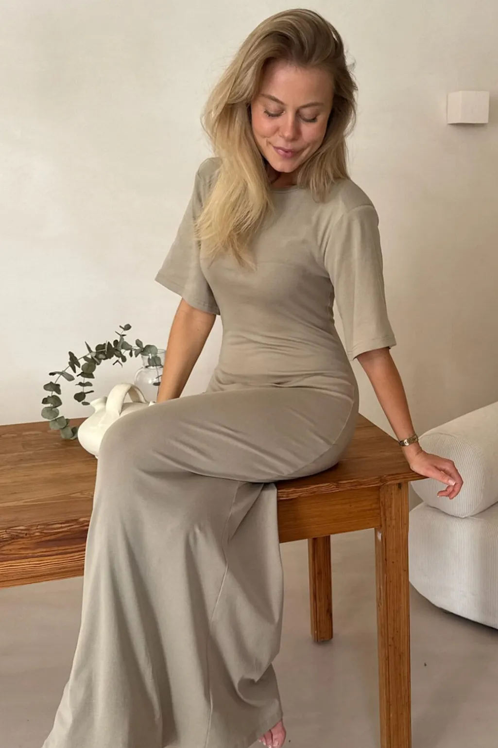 T-shirtkjole fra BYIC i khaki. Den har en tætsiddende silhuet fra top til tå og korte ærmer med rund halsudskæring.